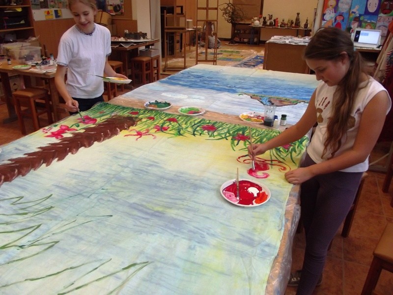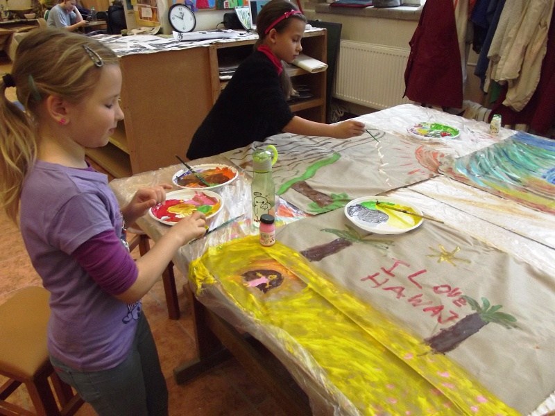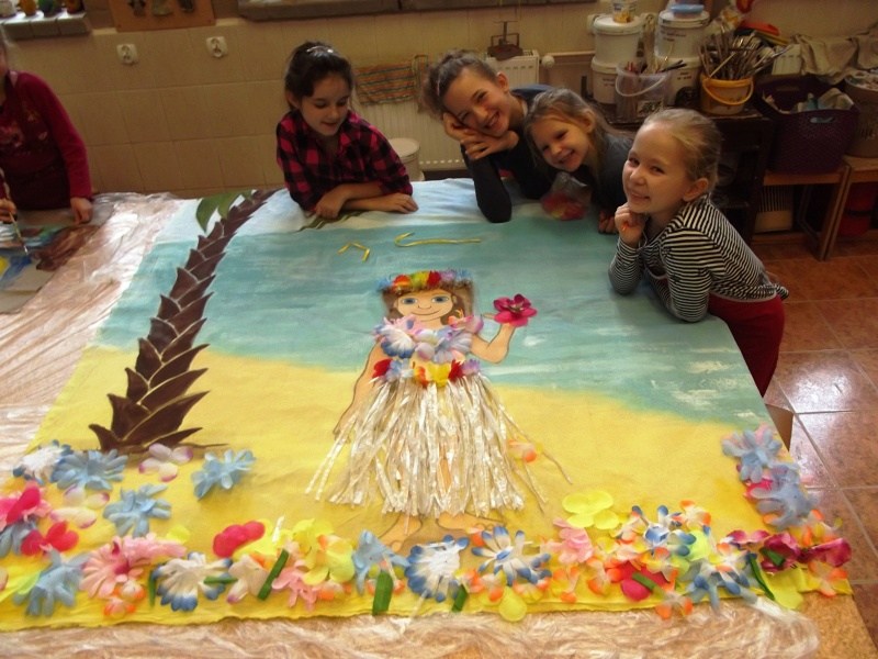 Na tkaninach pojawiły się rajskie plaże i orientalne kwiaty. Dziewczęta zaprojektowały i wykonały strój oraz dodatki dla tancerki afrykańskiej i hawajskiego Hula. Uczestniczki zajęć wspólnie oglądają zdjęcia i filmy dotyczące odległych miejsc na świecie, słuchają pięknych hawajskich pieśni. To czas dla wszystkich wyjątkowy. Nie tylko pracowity i twórczy, ale także pełen pozytywnej energii,śmiechu i wspólnych rozmów.