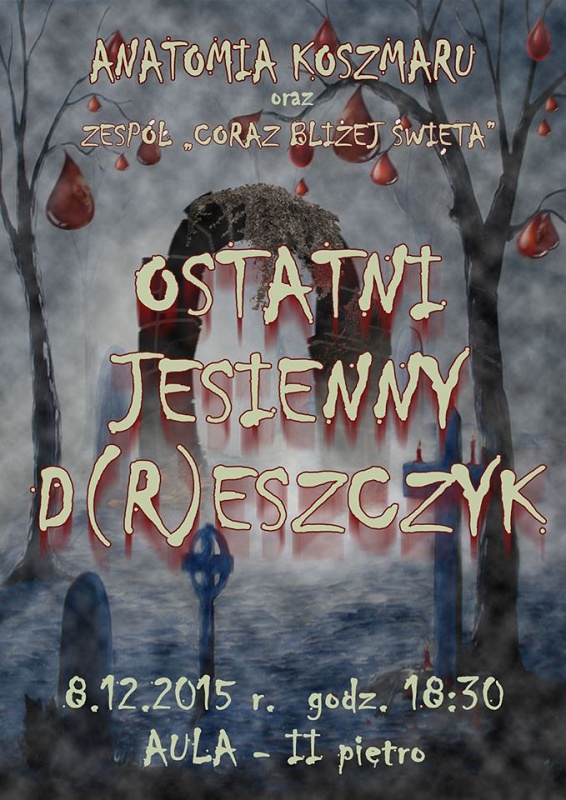 We wtorek, 8 grudnia o godz. 18:30 Pracownia Teatralna oraz Pracownia Muzyczna DO DE KA, zapraszają na spotkanie z teatrem formy. To teatr prześmiewczy, często groteskowy i ironiczny. Nasi wykonawcy, chcąc pożegnać porę roku, jaką jest jesień, postanowili rozprawić się z patetyczną zadumą, ekstatycznym uniesieniem, demonicznym strachem oraz paroma innymi poetycko-melancholijnymi naleciałościami. Zamiast tego proponują śmierć na wesoło, wszechogarniające szaleństwo tworzenia i kpinę ze stereotypów. Będą więc i duchy, i ludzie, i erotyzm, i marazm. Wszystkiego po trochu, bo czemu nie pozwolić sobie na odrobinę teatralnej swawoli? Wszystkiemu zaś będzie towarzyszyła muzyka na żywo wykonywana przez nowo powstały zespół o jakże makabreskowej nazwie „Coraz bliżej święta”. W ich wykonaniu usłyszymy zarówno Nicka Cave’a jak i kompozycje Dannego Elfmana. Zapraszamy serdecznie na pożegnanie jesieni! Spektakl przeznaczony dla osób od 13 roku życia.
