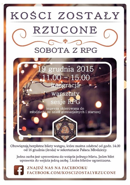 Zbliżają się Święta, zbliżają się ferie i zbliżają się również grudniowe „Kości”. Jak co miesiąc zapraszamy na kolejną odsłonę naszego fabularnego wydarzenia. Tym razem z uwagi na towarzyszący wszystkim świąteczny nastrój przygotowaliśmy dla Was parę niespodzianek. Oprócz integracji będą miały miejsce warsztaty dla powstałych drużyn. Zgodnie z Waszą prośbą będzie więcej praktyki, a mniej teorii. Oczywiście zapraszamy nowicjuszy na nasze wydarzenie. Zawsze chętnie wytłumaczymy, czym są gry fabularne (RPG) i zaprosimy do wspólnej zabawy.