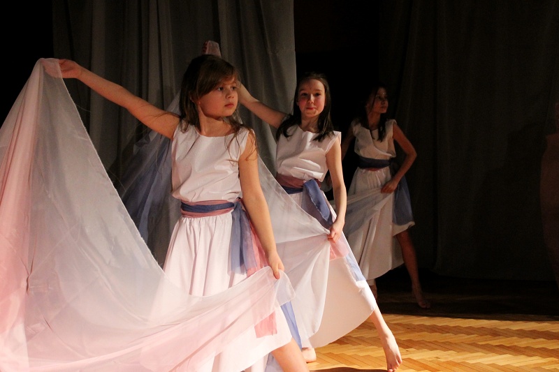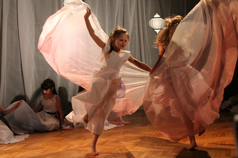 Przed wejściem do pałacowej auli, można było obejrzeć wystawę prac malowanych na tkaninach, przygotowaną przez dziewczęta z Pracowni Tańca Etnicznego, podczas Etnicznych Warsztatów Twórczych.