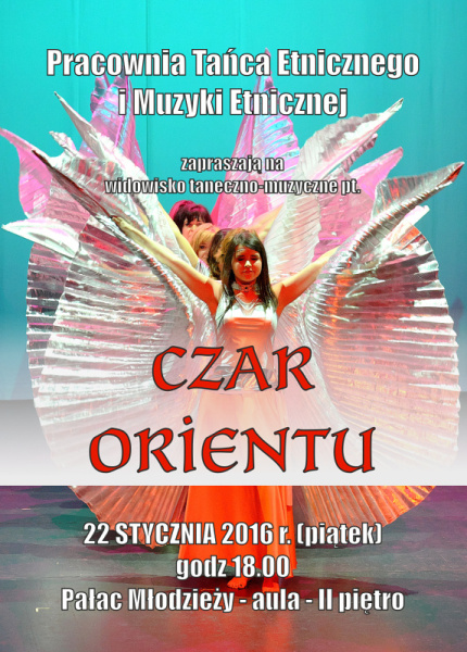 W piątek, 22 stycznia w auli Pałacu Młodzieży zrobiło się prawdziwie egzotycznie, a to wszystko za sprawą tańca i muzyki orientalnej. Widowisko ,,Czar Orientu”, przygotowane przez p.Justynę Kozłowską obejrzała licznie zgromadzona publiczność. Na scenie wystąpiły dwa pokolenia tancerek. Wraz z dziećmi tańczyły ich mamy i ciocie. Uczestniczki Pracowni Tańca Etnicznego – gr. Etnika, Mała Etna, Etna i dojrzałe tancerki zaprezentowały tańce z rejonów Afryki Północnej.