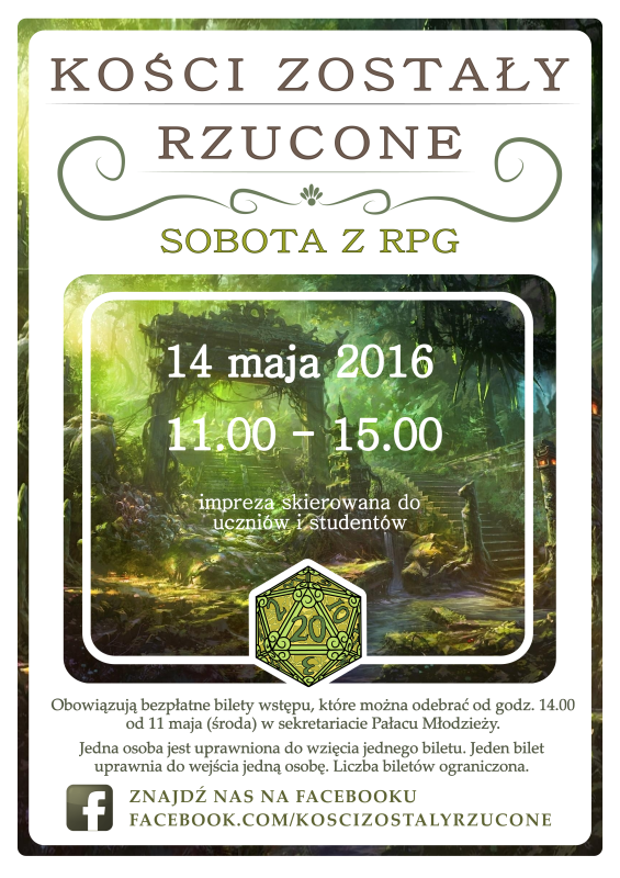 Jeszcze nie zdążycie odpocząć po majówce, a my już zapraszamy Was na kolejne „Kości”! Jak co miesiąc zapewniamy Wam mnóstwo zabawy w świecie wyobraźni. Będzie można przez chwilę poczuć się niczym członek tolkienowskiej drużyny, spróbować zapanować nad swą nieokiełznaną magiczną mocą, udać się w podróż w odmęty czasu lub spróbować przeciwstawić się wszetecznym sługom zła. Wszystko to w ciągu zaledwie trzech godzin. Nasi Mistrzowie Gry przygotowali dla Was kolejną porcję przygód, które należy przeżyć. Pamiętajcie, wstąpcie po bezpłatne bilety do sekretariatu Pałacu Młodzieży i zanurzcie się z nami w świat gier fabularnych!