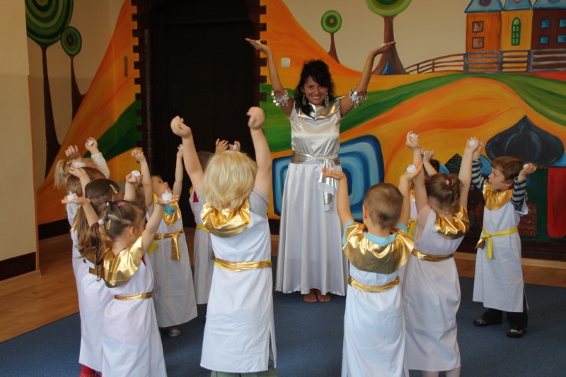 Przez cały rok szkolny pałacowe przedszkolaki uczestniczyły w SPOTKANIACH Z MUZYKĄ I TAŃCEM ETNICZNYM. Na zajęciach dzieci miały okazję oddać się magii tańców etnicznych i poznać ciekawą, barwną kulturę innych egzotycznych miejsc na Ziemi. Poznawały charakterystyczną dla m.in. Afryki, Hiszpanii, Hawajów i krajów Orientu muzykę, choreografie, rekwizyty i instrumenty wykorzystywane przez tancerzy. Podczas ostatniego spotkania podróżowały nie tylko w przestrzeni, ale i w czasie. Prowadząca spotkanie p. Justyna Kozłowska z Pracowni Tańca Etnicznego, zabrała dzieci do starożytnego Egiptu.