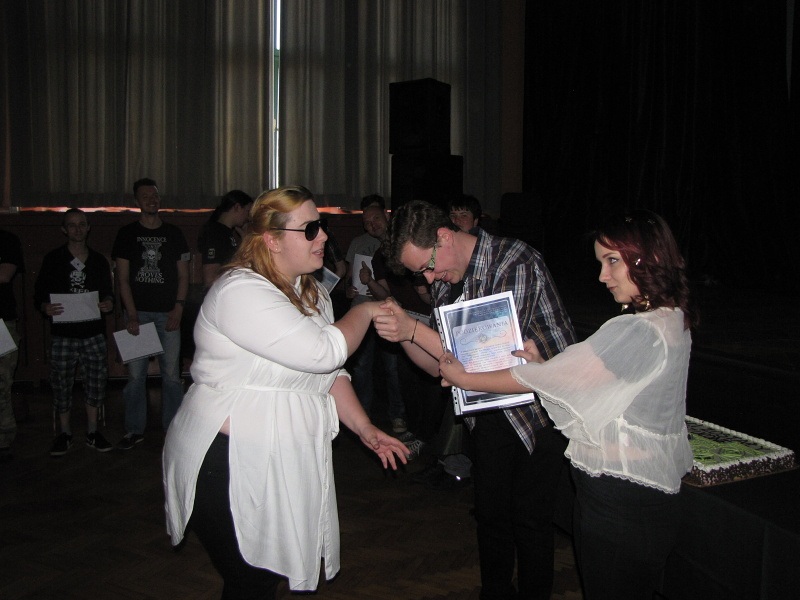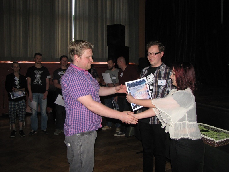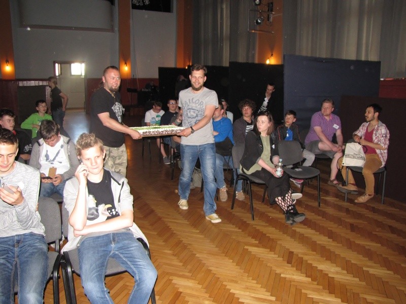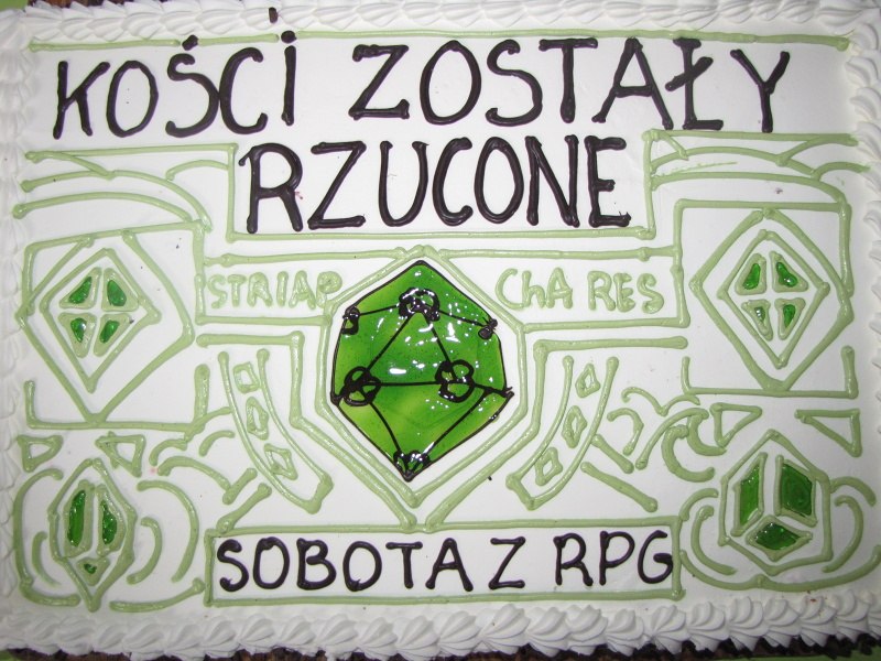 Po dwóch i pół godziny grania nadszedł czas na niespodziankę dnia – specjalnie przygotowany na tę okazję tort oraz krótki filmik podsumowujący cały rok wytężonej pracy. Odbyła się również dyskusja z graczami na temat potencjalnego udoskonalenia organizacji naszej imprezy oraz uroczyste wręczenie podziękowań naszym Mistrzom Gry. Nad talerzykami pełnymi od ciasta wszyscy uczestnicy omawiali swoje doświadczenia związane z „Kośćmi” oraz plany na wakacje. Już nie możemy się doczekać września i kolejnej odsłony „Kości zostały rzucone. Sobota z RPG”!