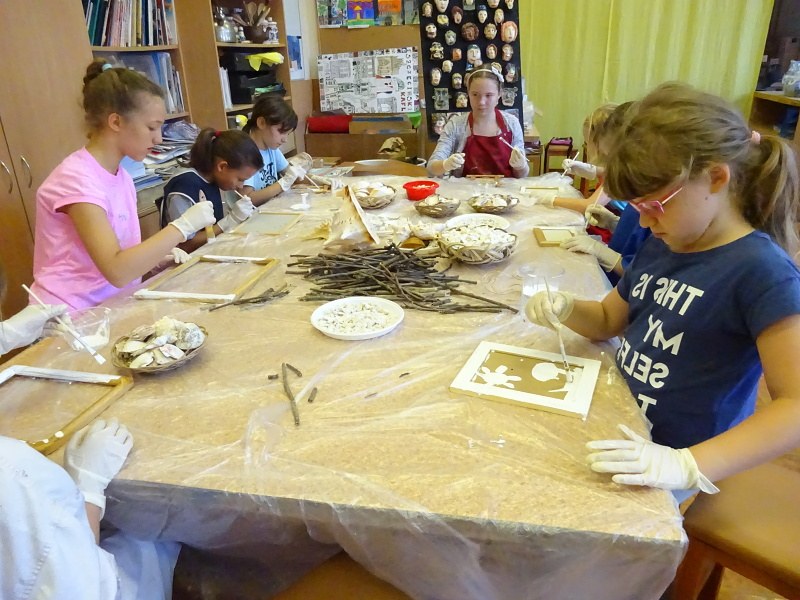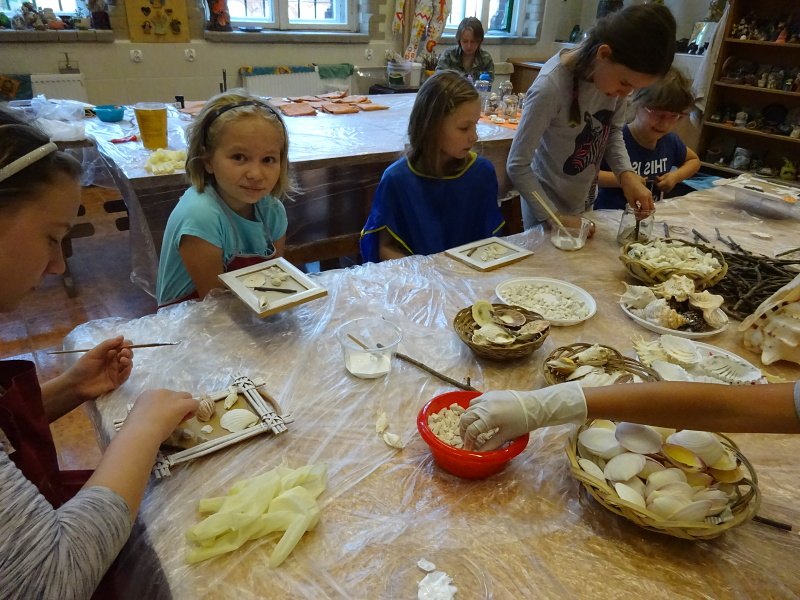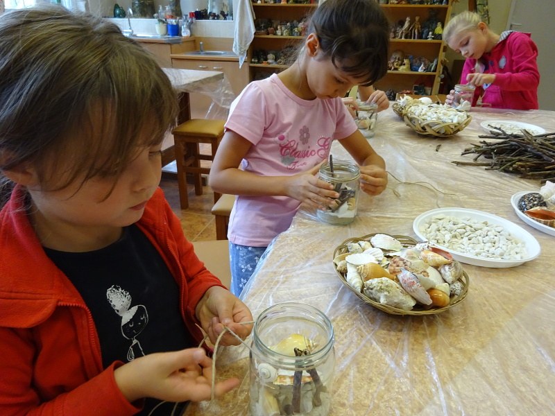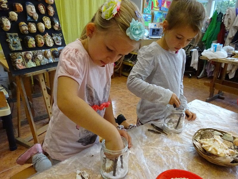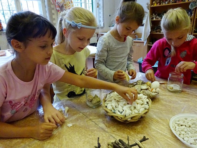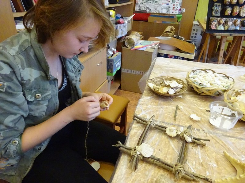 Pracownia Tańca Etnicznego pod kierunkiem p.Justyny Kozłowskiej podczas pierwszych w tym roku szkolnym Etnicznych Warsztatów Twórczych jak zawsze tworzyła i przenosiła się w wyobraźni do innych miejsc na świecie. Dziewczęta wspominały wakacje, podróże, a przede wszystkim wspólny warsztatowy wyjazd do Cieszyna i występ pod palmami w Połczynie Zdroju. Na stole pojawiły się różne okazy muszli, rozgwiazdy, a także suche gałązki roślin, kamyki i piasek. To właśnie z tych elementów tancerki wykonały przepiękne ozdoby i dekoracje. Wystawę prac zobaczymy podczas planowanego na styczeń taneczno -muzycznego widowiska.