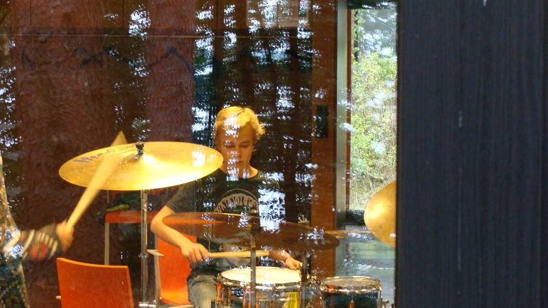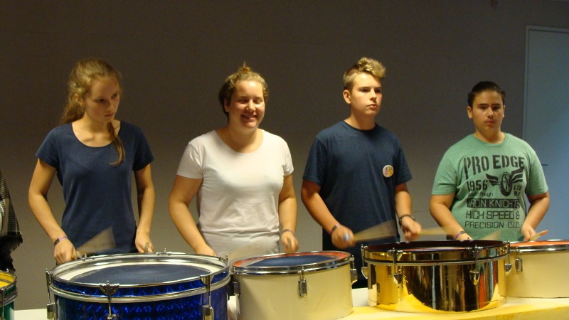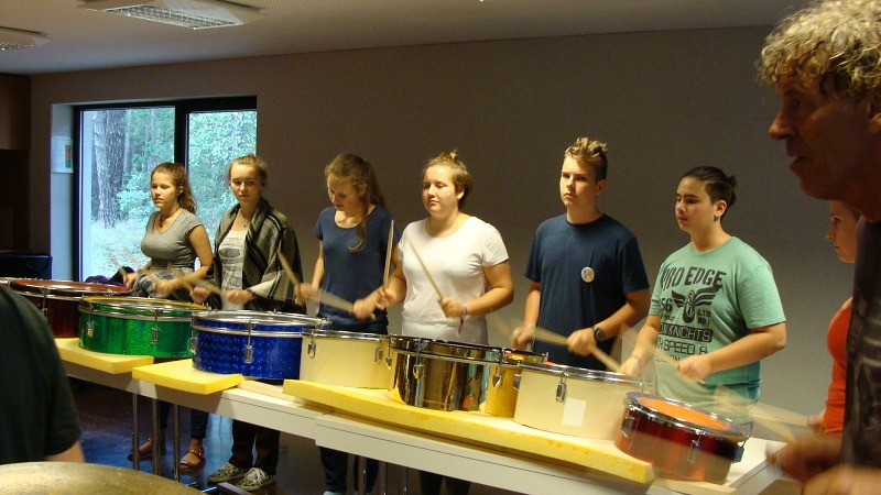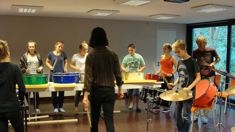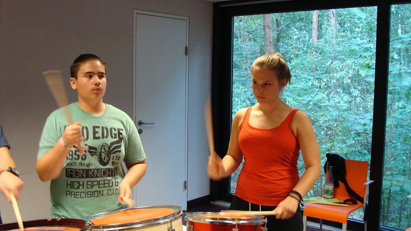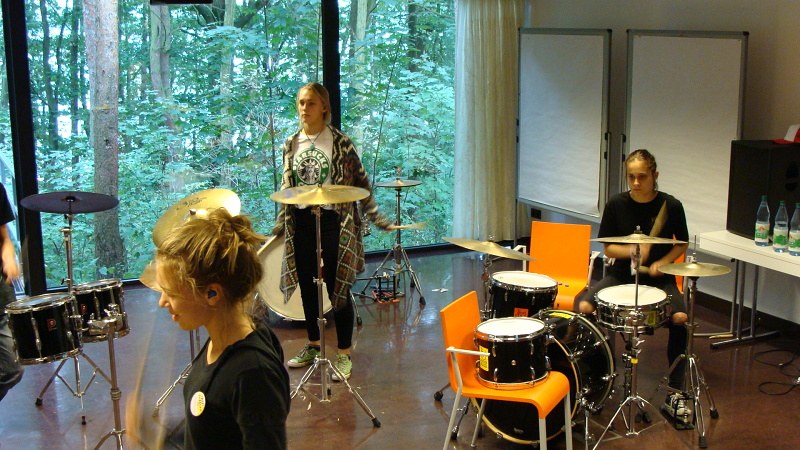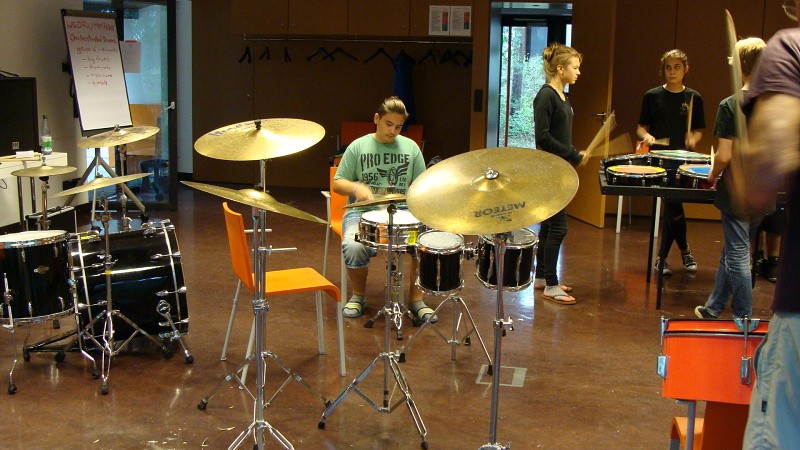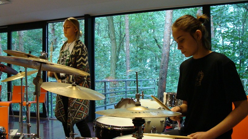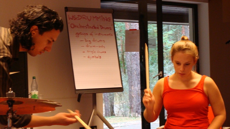 W piątek 16 września około godziny 8:30 wjechaliśmy z naszymi bębnami spod Pałacu Młodzieży. Do Blossin dotarliśmy około godziny 11:30. Po zameldowaniu się w hotelu, oficjalnym otwarciu i pysznym obiedzie poszliśmy na pierwsze warsztaty perkusyjne. Były one prowadzone pod okiem trzech profesjonalnych perkusistów pochodzących z Niemiec i Włoch. Graliśmy w świetnie wyposażonej pracowni na kilku rodzajach instrumentów: dużych bębnach, tom tomach, talerzach i całym zestawie perkusyjnym, tak, że każdy w miarę swoich umiejętności znalazł coś dla siebie. Zajęcia prowadzone były w bardzo twórczej, luźnej atmosferze, co dawało nam ogromną satysfakcję z samego grania. Często graliśmy bez przerwy przez ponad godzinę i świetnym odpoczynkiem dla naszych przemęczonych uszu było wychodzenie na malutki taras widokowy i wsłuchiwanie się w odgłosy lasu, w którym położona była pracownia. Wieczorem, po kolacji udaliśmy się na występy na żywo, w których prowadzący różnych warsztatów prezentowali swoje imponujące umiejętności. Trzech naszych nauczycieli zrobiło niesamowity pokaz improwizacji, który podobał nam się tak samo jak prezentacje brazylijskiej sztuki walki Capoeira i street dance. Po długim i intensywnym dniu wróciliśmy do swoich pokoi.