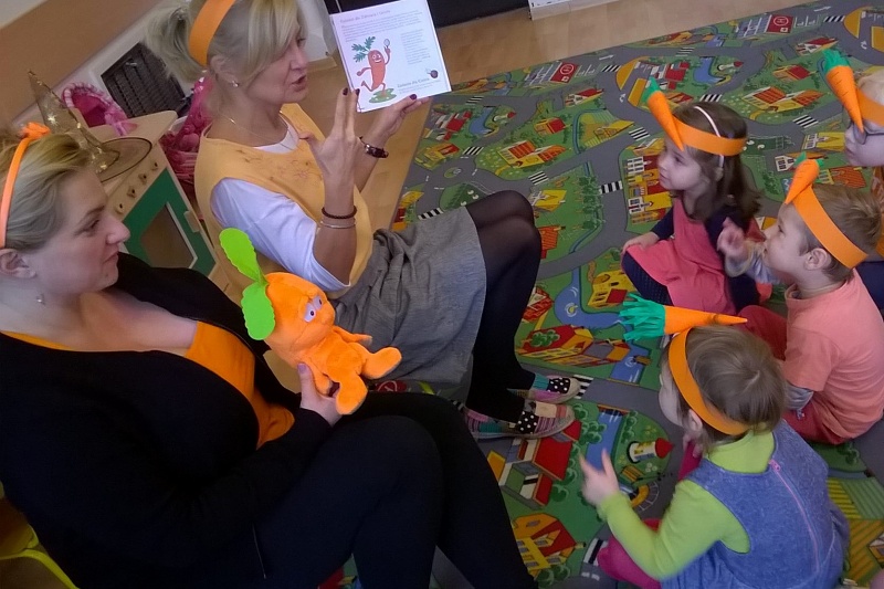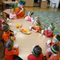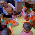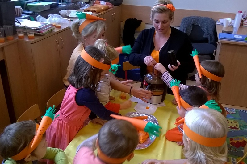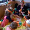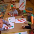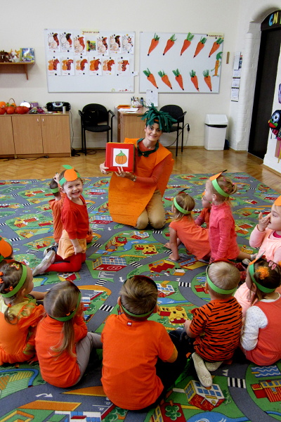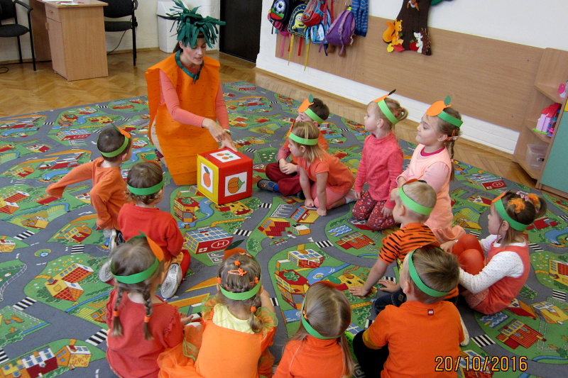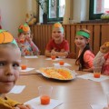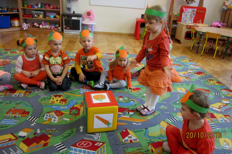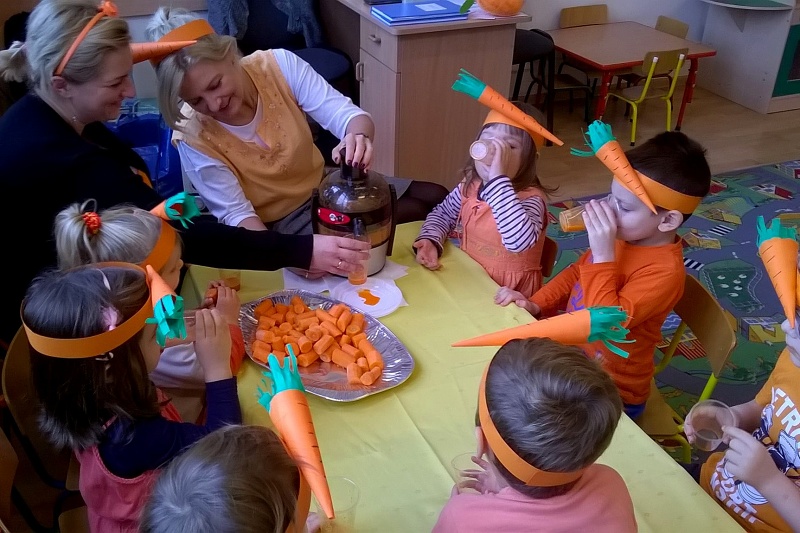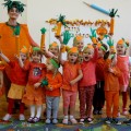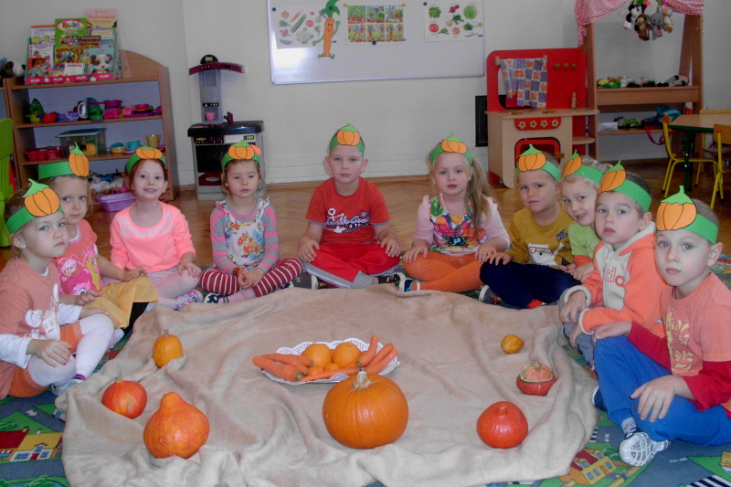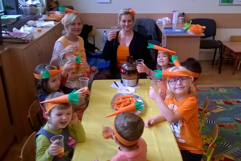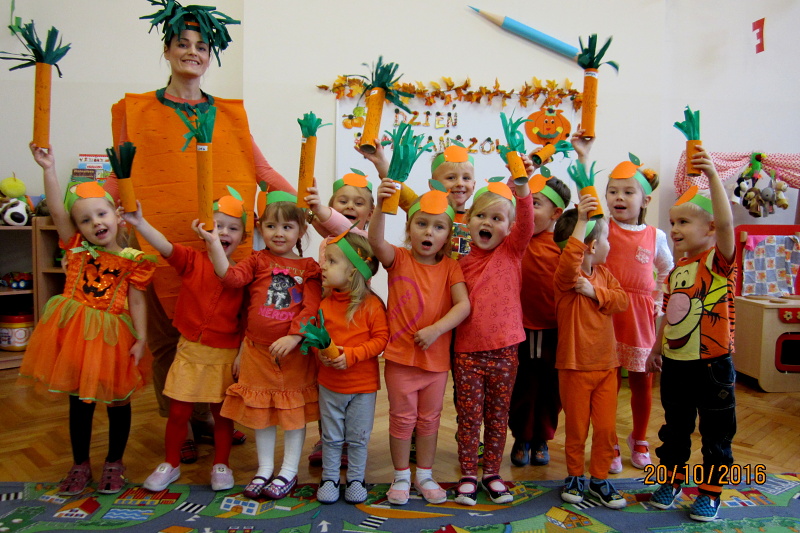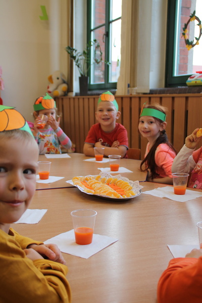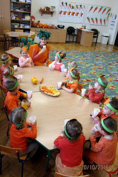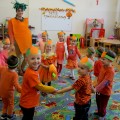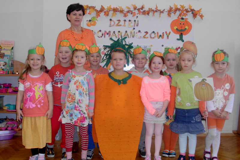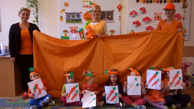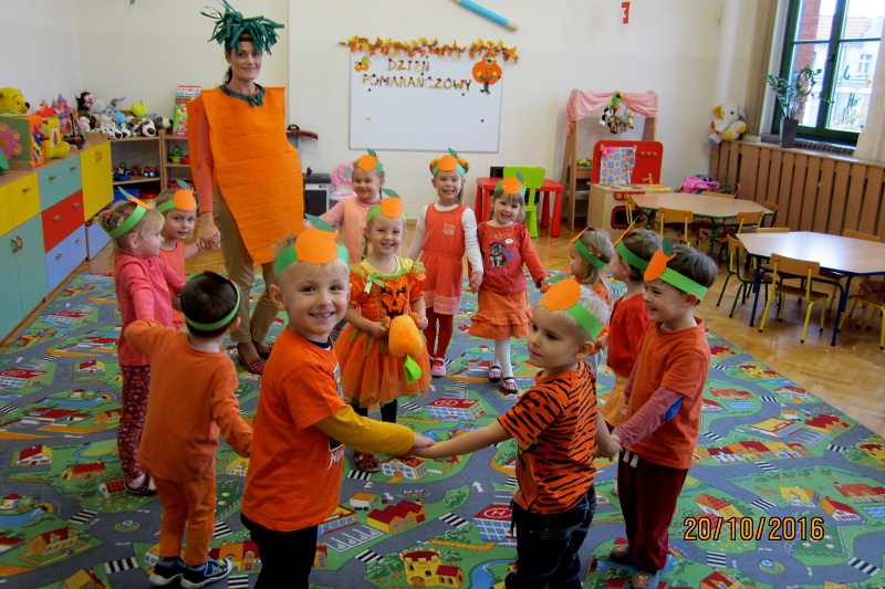 Dzień był pełen niespodzianek. Przedszkolaki uczestniczyły w zabawach ruchowych, odgadywały zagadki, śpiewały piosenki oraz tańczyły. Z wielką ochotą degustowały przygotowany przez siebie sok marchewkowy oraz świeże warzywa i owoce w kolorze pomarańczowym. Podczas kolorowego dnia przedszkolaki malowały „Marchewkowo-dyniowy zawrót głowy” oraz dowiedziały się jak ważne jest jedzenie owoców i warzyw – w tym właśnie tych, pomarańczowych.