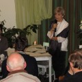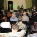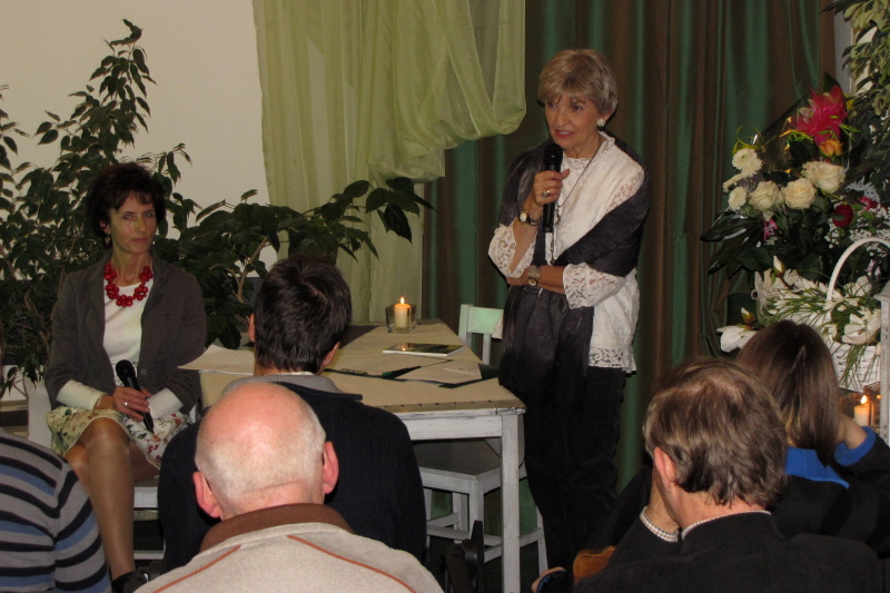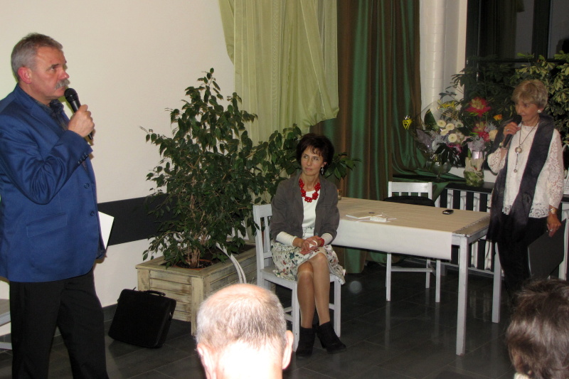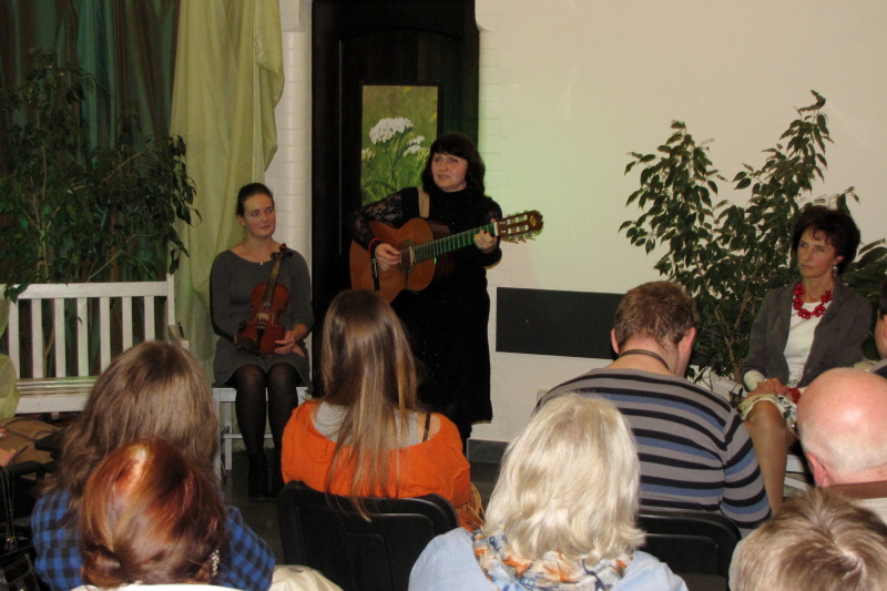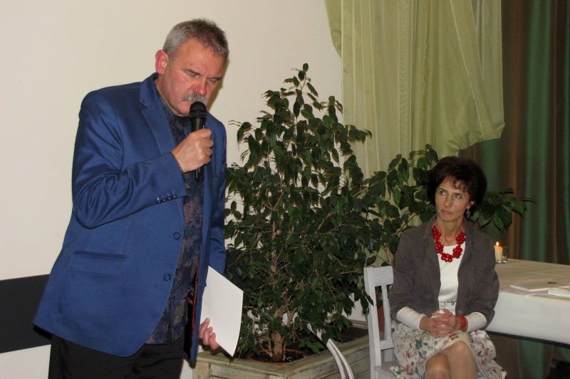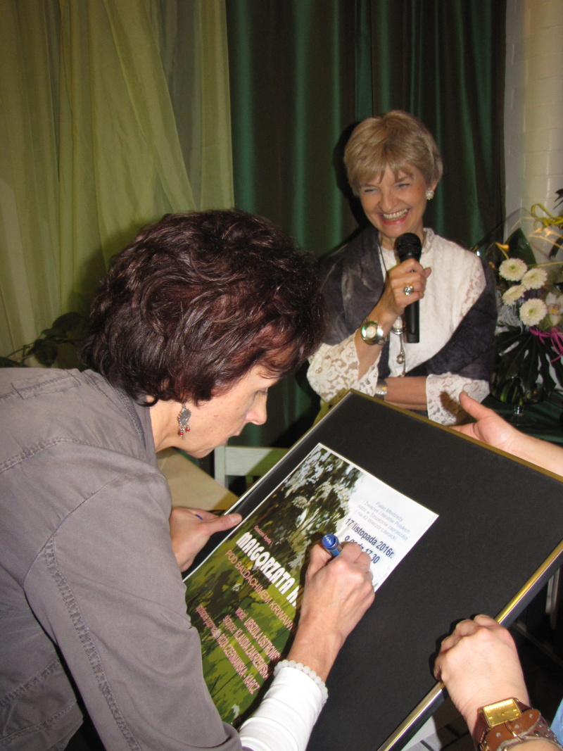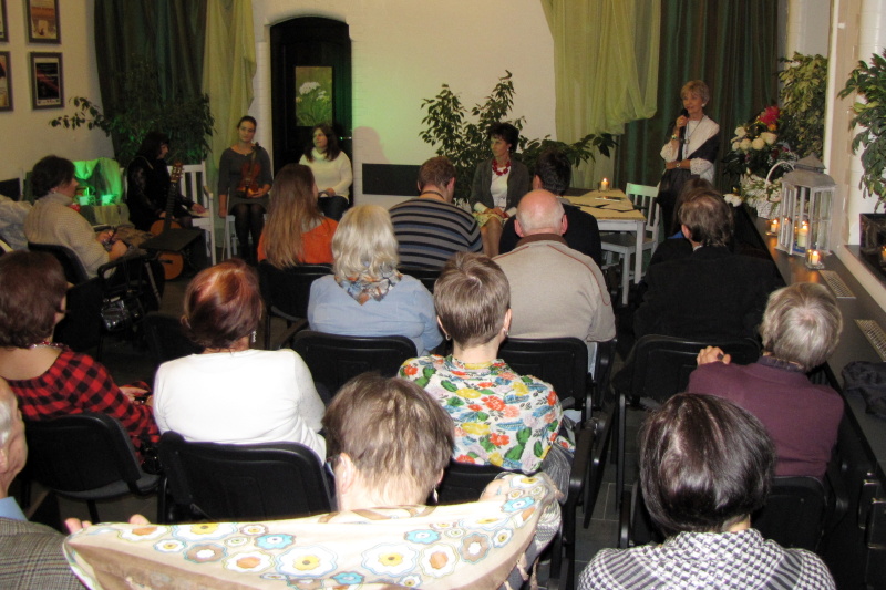 Wieczór rozpoczął występ muzyczny skrzypaczki Klaudii Zakrzewskiej, która wykonała przebój Celine Dion My heart will go on wprawiając publiczność w refleksyjny nastrój. Po powitaniu zaproszonych gości i przybliżeniu sylwetki poetki przez Różę Czerniawską-Karcz, przyszedł czas na poezję – główny punkt wieczoru. W ciszy, jaka nastała na sali, usłyszeliśmy przerzucanie kartek otwieranego tomiku „Pod baldachimem krwawnika” debiutanckiego tomu Małgorzaty Hrycaj, wydanego przez krakowskie Wydawnictwo „Signo” pod redakcją Magdaleny Węgrzynowicz-Plichty, by po chwili autorka wyrecytowała wiersze miłość jak woda – jak ja oraz bezsenność. Zrobiło się zmysłowo, kiedy barwne i finezyjne erotyki zaczęły grać pierwsze skrzypce, zwłaszcza, kiedy miłosnym westchnieniom towarzyszyły muzyczne przerywniki w poetycki dialog między Małgorzatą Hrycaj a Różą Czerniawską-Karcz. W prawdziwą ucztę dla uszu zabierała nas kilkakrotnie Urszula Ostrowska, która aksamitnym głosem zaśpiewała takie piosenki jak Miłość ogólnie, poprzedzając deklamację Róży Czerniawskiej-Karcz i Anny Jakubczak wierszy Erotyk morski i Erotyk górski czy, aby odgonić jesienny mróz piosenką Wiosna, zaś damsko-męskie przekomarzanie z poematów Agłaja, liczby doskonałe, czy nie mam psychopatycznych skłonności zostało zamknięte klamrą w utworze Na jedną nutkę.