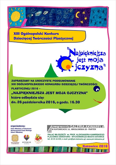 Miło nam poinformować, że Martyna Napiontek /lat 9/ z Pracowni Plastycznej pod opieką artystyczną Marioli Grochowskiej otrzymała wyróżnienie honorowe w XIII Ogólnopolskim Konkursie Dziecięcej Twórczości Plastycznej „Najpiękniejsza jest Moja Ojczyzna 2016” organizowanym przez Pałac Młodzieży w Katowicach.