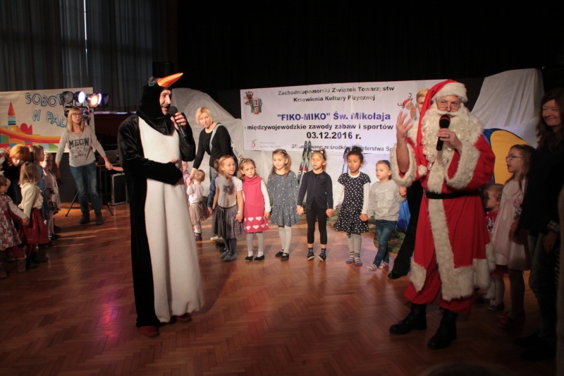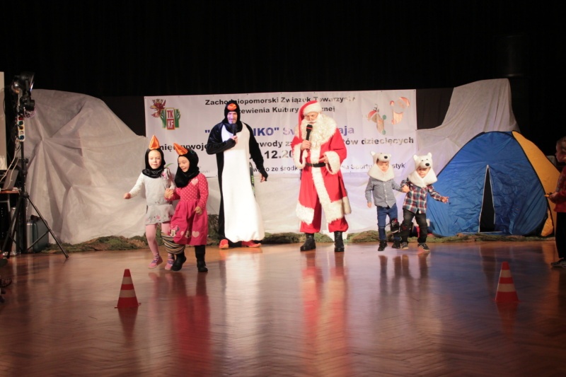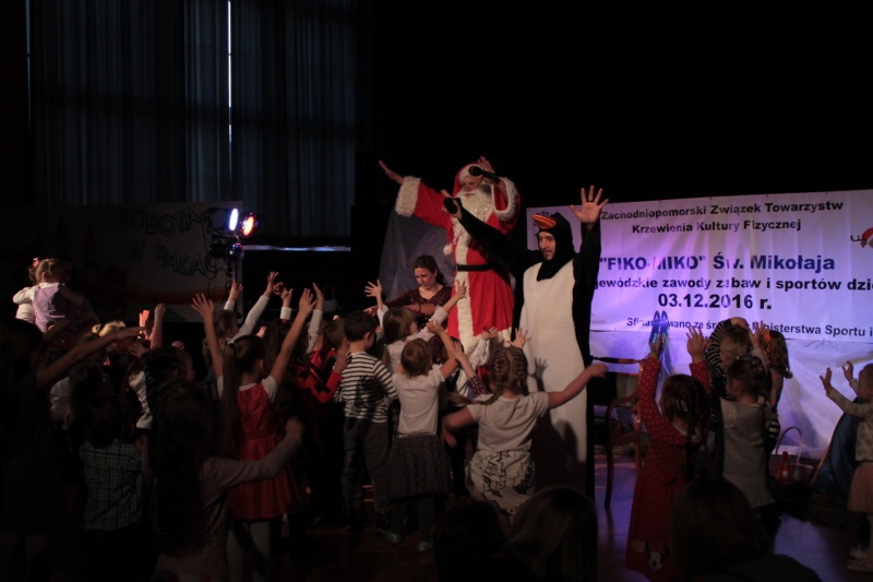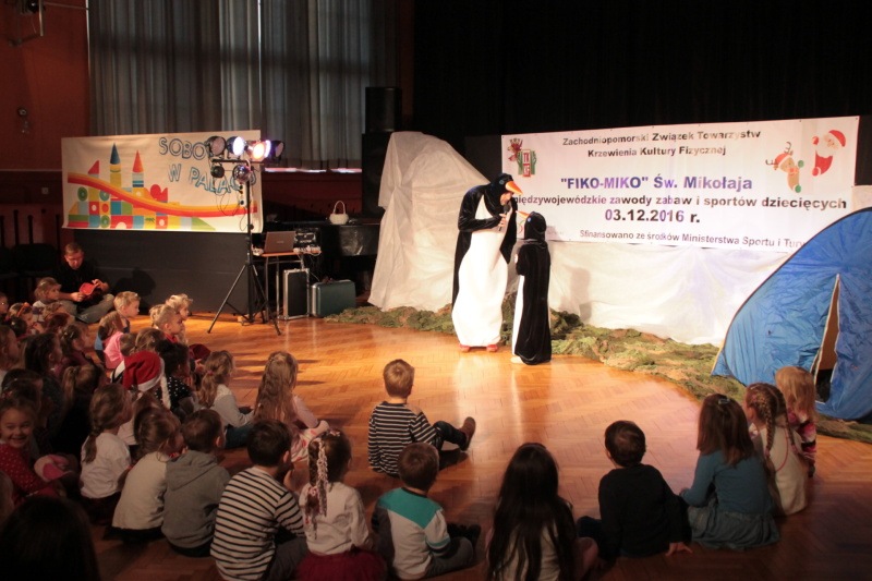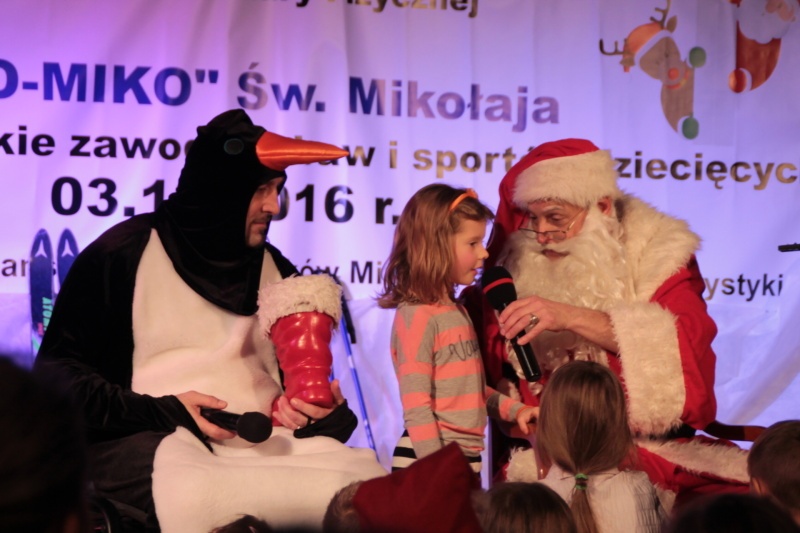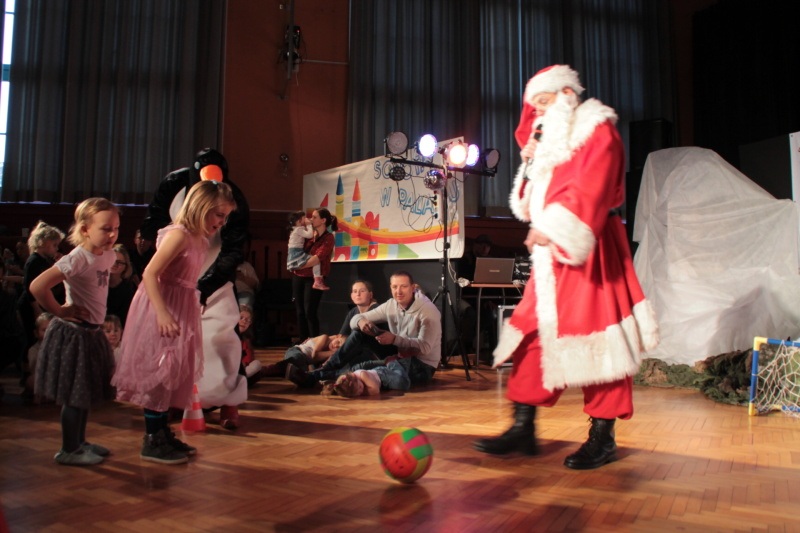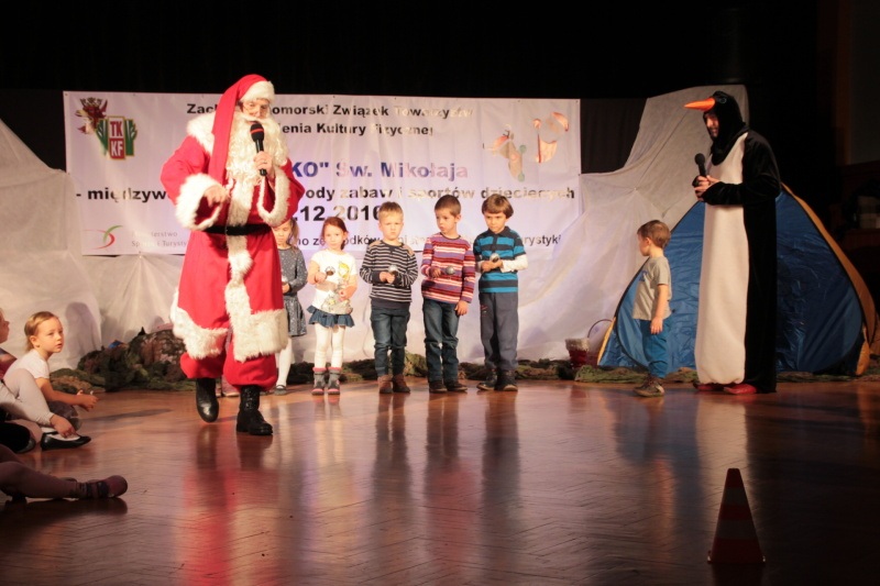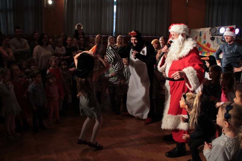 Jak co roku o tej porze, do Pałacu Młodzieży zawitał Święty Mikołaj. Tego dnia pałacowa aula zmieniła się w lodową krainę, w której mieszkają pingwiny. Gdy Mikołaj się w niej pojawił pomógł małemu pingwinkowi pozbyć się złego nawyku jakim było niemówienie prawdy, a potem zaprosił wszystkie dzieci do zabawy. Była muzyka i taniec a także wiele konkurencji, w których można było sprawdzić swoją szybkość i zręczność. Rzucanie rybą, wyścigi zaprzęgów, zawody misiów i pingwinków – wszystkie te zabawy wywołały mnóstwo emocji. Nie łatwo przecież strzelić gola, gdy na bramce stoi sam Święty Mikołaj! A przeniesienie bombki na łyżeczce to też nie lada wyczyn! Trzeba uważać by bombka z niej nie spadła! Wszyscy uczestnicy świetnie sobie radzili i wykonywali zadania na medal! Święty Mikołaj przypomniał wszystkim o tym, jak ważne jest dbanie o bezpieczeństwo w trakcie każdej zabawy.