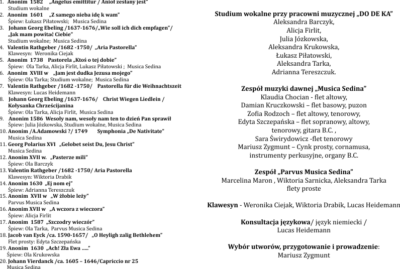 W czwartkowy wieczór, 22 grudnia odbył się koncert świąteczny promujący nagraną i wydaną wcześniej płytę, zawierającą muzykę związaną z tradycją świąt Bożego Narodzenia. Utwory dawno zapomniane z terenów XVII wiecznej Polski oraz naszego Pomorza zostały wykonane przez uczestników Studium wokalnego przy pracowni DO DE KA, zespołów „Parvus Musica Sedina ” „Musica Sedina” oraz solistów. Wśród 21 utworów, na który złożył się program koncertu, znalazły się kompozycje, które ujrzały światło dzienne po raz pierwszy od swojego powstania w XVII wieku. Oczywiście nie mogło zabraknąć też muzyki związanej z naszym miastem z okresu XVI i XVII wieku powstałej w tradycji obchodzenia czasu świątecznego w dawnych czasach. Na koniec wszyscy wykonawcy wykonali pieśń, której tekst powstał w dramatycznych okolicznościach w grudniu 1944 roku spod pióra Dietricha Bonhoeffera, wielkiego myśliciela i człowieka, pastora, którego działalność związana była również z naszym miastem i Pomorzem w czasach poprzedzających wybuch II wojny światowej. Do jakże pięknego i wzruszającego tekstu w latach 70 ubiegłego wieku kompozytor Siegfried Fietz ułozył melodie. Tym wzruszającym przesłaniem wykonawcy zakończyli ten piękny i jedyny w swoim rodzaju wieczór …..