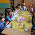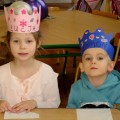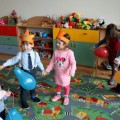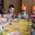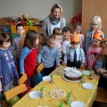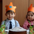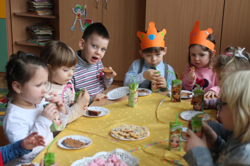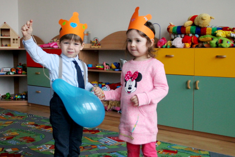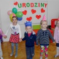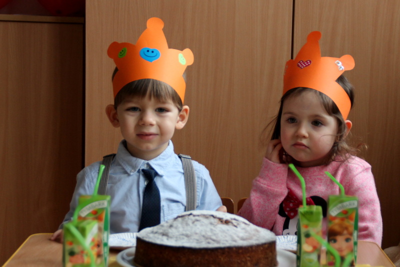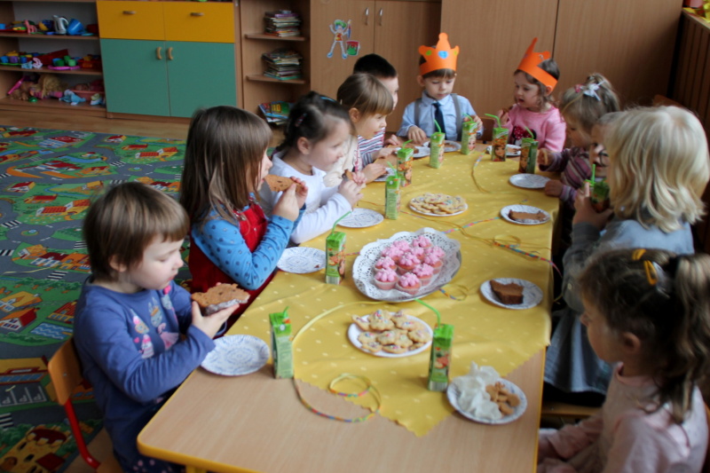 Jubilaci otrzymali pamiątkowe korony i laurki. Dzieci zaśpiewały głośne „100 lat” i złożyły życzenia bohaterom dnia. Następnie przyszedł czas na wesołe tańce i zabawy ruchowe. Rodzice, jak zawsze, ku radości dzieci, zadbali o pyszny słodki poczęstunek, za co serdecznie dziękujemy! Jeszcze raz Jubilatom życzymy samych cudownych dni!