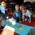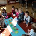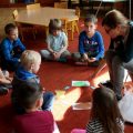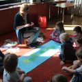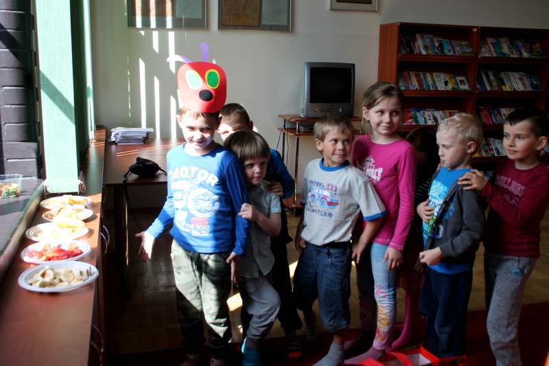 Nazwy dni tygodnia, nazwy owoców i inne słowa występujące w tekście przeczytanej książki utrwalały dzieci na zajęciach prowadzonych przez p. Annę Kozłowską w Pracowni języka angielskiego. Dzięki książce Erica Carla pt. „The very hungry Caterpillar” mali uczestnicy zajęć dowiedzieli się również, jak to się dzieje, że gąsienica zmienia się w motyla. Na zakończenie sami zmienili się w bardzo głodną gąsienicę, która ze smakiem zjadała pyszne owoce.