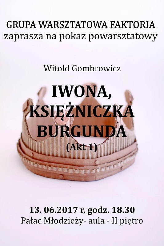 We wtorek, 13 czerwca zapraszamy bardzo serdecznie na pokaz powarsztatowy FAKTORII, teatralnej grupy początkującej, będącej pod skrzydłami Marcela Mroczka. W tym roku efektem ich całorocznej pracy będzie pierwszy akt znanego dramatu Witolda Gombrowicza „Iwona, księżniczka Burgunda”.