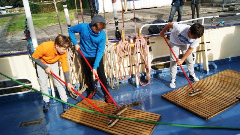 O 16.00 powłócząc nogami nasi uczniowie udali się do koi, gdzie natychmiast posnęli. Sen znowu długi nie był, bo o 18.00 zaczynaliśmy służbę w kuchni, czyli tzw. kambuzie. Młodzi żeglarze wraz z kukiem – kucharzem przygotowywali kolację. Rozkładali zastawę stołową, kroili warzywa, układali wędliny na półmiskach, robili herbatę itp. A w trakcie samej kolacji obsługiwali pozostałą załogę, uzupełniali brakujące elementy na stołach, donosili chleb itd. Po kolacji zmywak i sprzątanie wszystkiego. Więc około godziny 21.00, gdy zakończyli wszelkie prace w kambuzie z wielką radością udali się do koi, aby się przespać.
