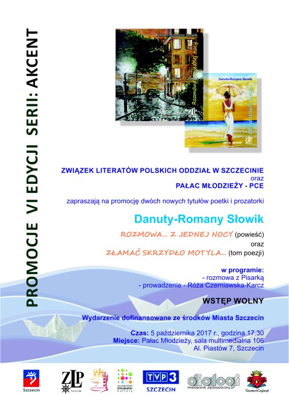 W czwartek, 5 października 2017 r., o godzinie 17.30 w Pałacu Młodzieży – PCE przy al. Piastów 7 w Szczecinie, w sali multimedialnej 106 odbędzie się wieczór literacki z cyklu z pisarzami i poetami nie tylko szczecińskimi. Tym razem będzie to promocja dwóch książek DANUTY-ROMANY SŁOWIK, wydanych w serii akcent: „Rozmowa… z jednej nocy” (powieść) i tom poezji „Złamać skrzydło motyla”.