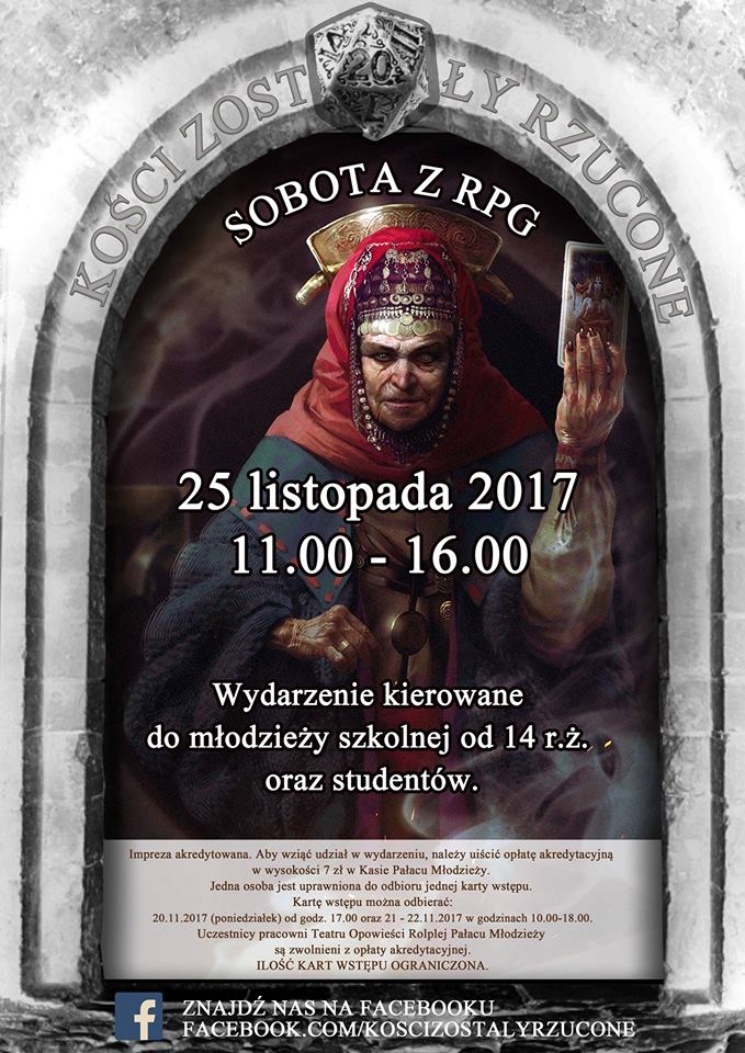 „Duchowy” październik za nami, nadszedł czas na wróżbiarski listopad! Zapraszamy na XXI odsłonę naszej eRPeGowej imprezy. Pozwólcie, by nasi Mistrzowie Gry zabrali Was w zakamarki tajemnic przeznaczenia, pomiędzy annały zakazanej wiedzy albo w głąb nieodgadnionych paranornalnych umysłów. Jak to się dzieje, że niektórzy wiedzą więcej? Czy istnieją istoty tkające czyiś los? Czy siły rządzące nami pochodzą z tego czy z innego świata? To tylko parę inspiracji dla naszych narratorów. Chcecie poznać, co powstanie z tych inspiracji? Zapraszamy już 25 listopada w progi Pałacu Młodzieży!