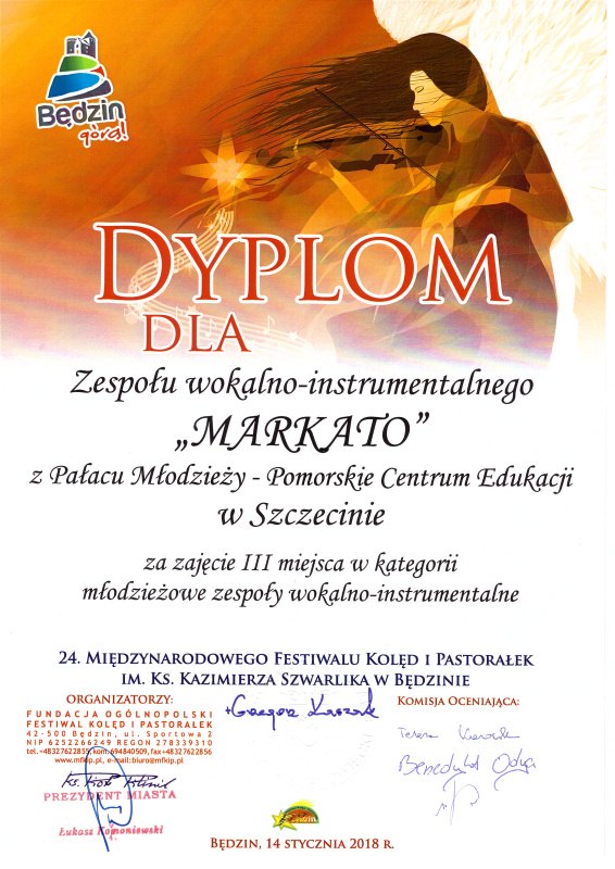 Miło nam poinformować, że zespół MARKATO /Pracowni Wokalna, pod opieką art., Dariusza Chmielewskiego/ zajął III miejsce na XXIV Międzynarodowym Festiwalu Kolęd i Pastorałek w Będzinie. Kategoria młodzieżowe zespoły wokalno-instrumentalne! Nagroda to 500 zł ufundowane przez Fundację PKO Banku Polskiego.