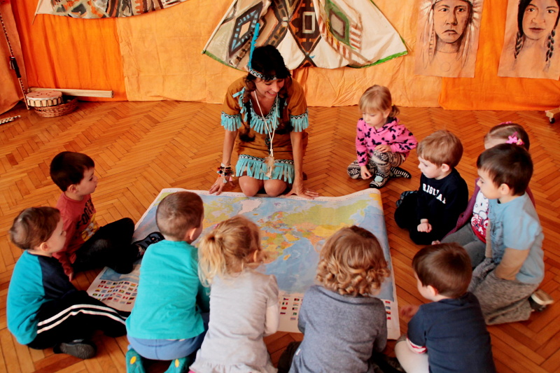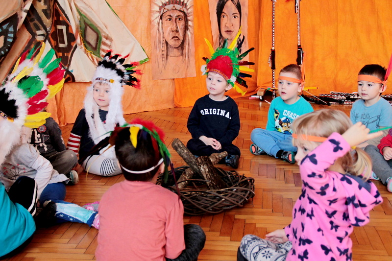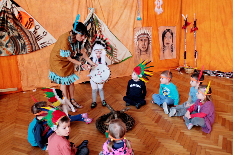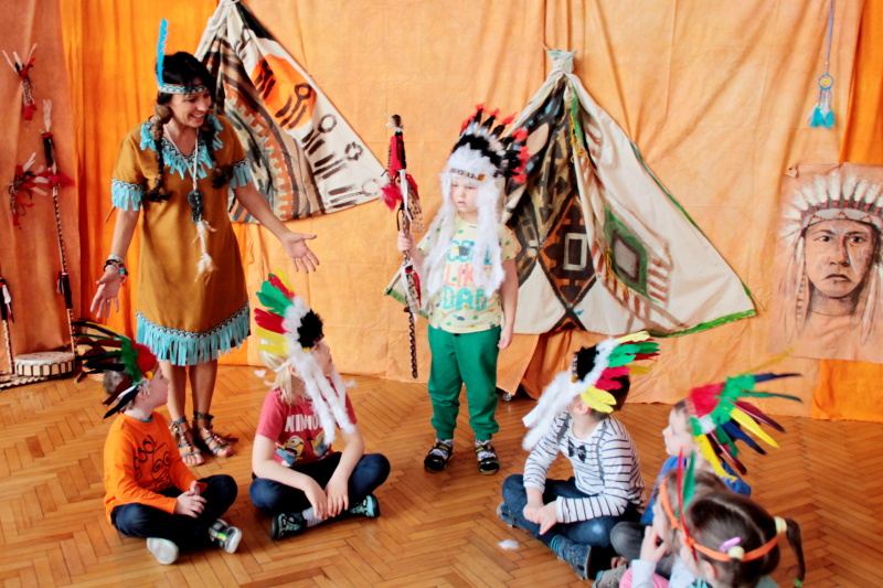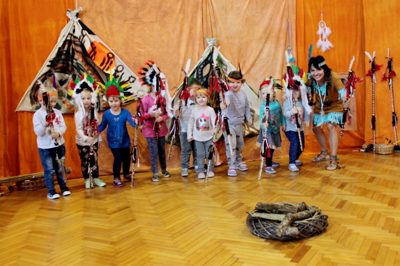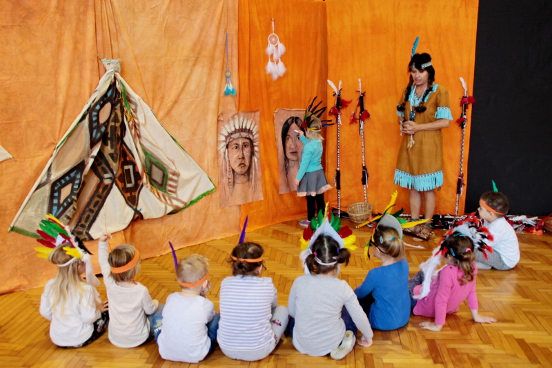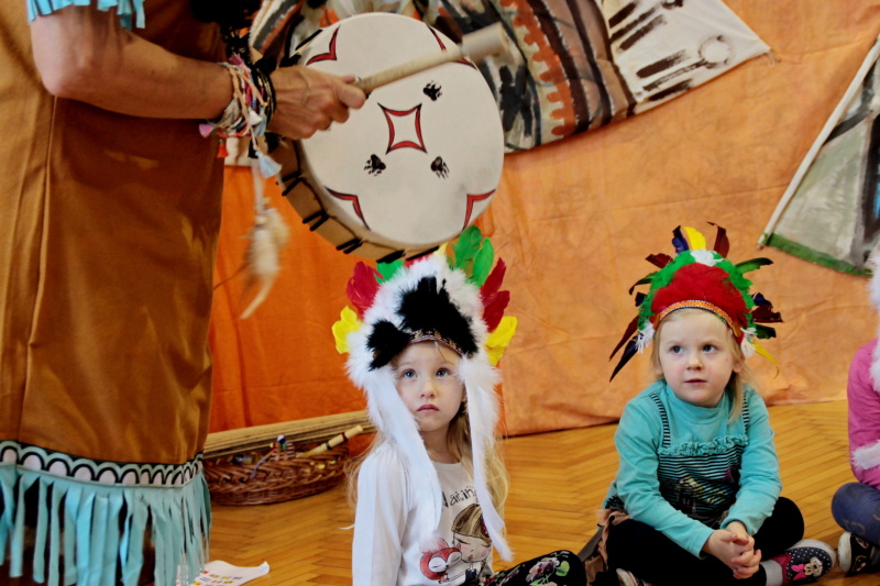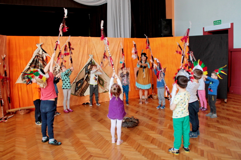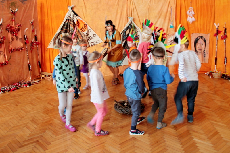 W lutym pałacowe przedszkolaki wyruszyły na kolejną, taneczną wyprawę! Tym razem ich przewodniczka, pani Justyna Kozłowska z Pracowni Tańca Etnicznego zabrała dzieci do Ameryki. Na początek były opowieści przy mapie, o tym jak Krzysztof Kolumb odkrył nieznany ląd. Maluchy palcem wyszukiwały Polskę, w której mieszkają i wspólnie zastanawiały się jak najprościej dotrzeć na ten odległy kontynent. Następnie dzieci miały okazję usłyszeć i zobaczyć niezwykłe, kolorowe stroje Indian, ozdoby i instrumenty. Pani Justyna opowiedziała im czym na co dzień zajmują się Indianie, jak żyją i jak się bawią. Był taniec, wspólne siedzenie przy ognisku a nawet ozdabianie twarzy. Czym jest tipi? Jak wygląda łapacz snów? Do czego służy kij deszczowy? To tylko niektóre ciekawostki, które miały okazję usłyszeć nasze przedszkolaki, a niektórzy nawet mieli szansę być przez chwilę wodzem!