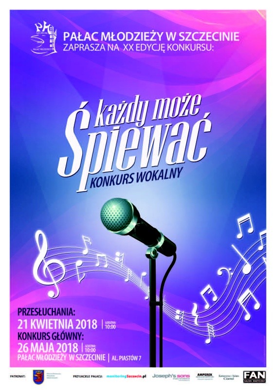 Pałac Młodzieży w Szczecinie zaprasza młodych wokalistów do udziału w jubileuszowej edycji konkursu „Każdy może śpiewać”. Już od dwudziestu lat na pałacowej scenie mają oni szansę wzbogacić doświadczenia artystyczne oraz zaprezentować swój dorobek artystyczny.