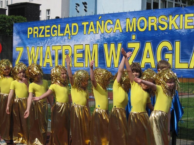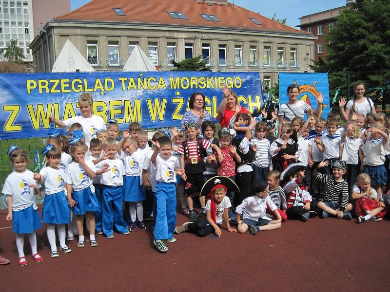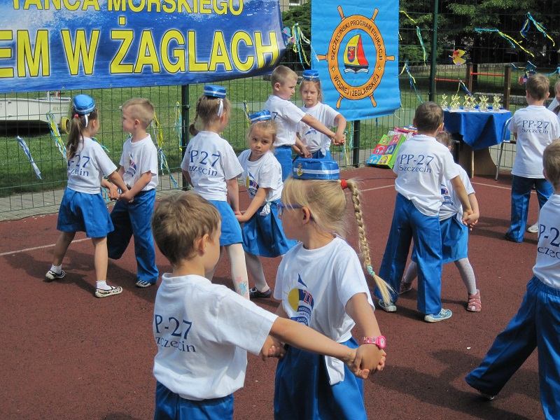 Niezwykła barwna i roztańczona „załoga” małych żeglarzy wypełniła rozsłoneczniony plac zabaw Przedszkola „Żagielek” przy ul. H. Pobożnego, gdzie w czwartek 17 maja br. odbył się 14. Przegląd Tańca Morskiego „Z wiatrem w żaglach”. Liczni goście i przyjaciele Przedszkola, m.in. z władz oświatowych, ludzie morza, rodzice, wychowawcy, i inni, podziwiali i oklaskiwali cały taneczny korowód piratów, żeglarzy, nimf i rusałek (jak na zdjęciach), z Neptunem na czele, z placówek przedszkolnych ze Szczecina ( z PP 5, 9, 50, 65, 66, ŚPEW, i SP 11), i z Polic, dodatkowo w oprawie umundurowanych studentów zaprzyjaźnionej szczecińskiej Akademii Morskiej. Te międzypokoleniowe więzi „morskiego” PP 27 z morskim Szczecinem trwają od lat, z „absolwentów” przedszkola wyrosło już spore grono ludzi morza, a dzisiejsi wychowankowie często zapraszani są na morskie i żeglarskie uroczystości, gdzie właśnie popisują się tańcem i piosenką morską…