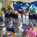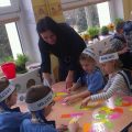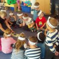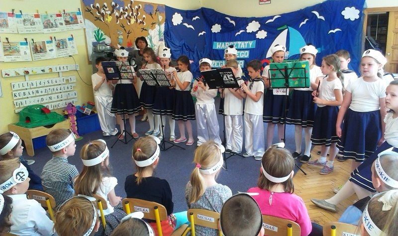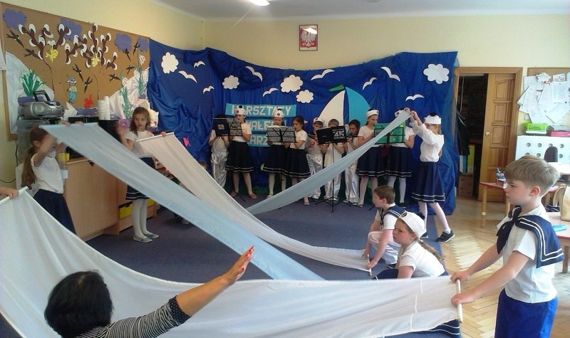 Również w kwietniu w przedszkolu odbyło się szantowo-muzyczne spotkanie, w czasie którego przedszkolaki poznały rytmy i piosenki żeglarskie, oglądały tańce marynarzy i słuchały melodii morskich granych na flażoletach w wykonaniu zaproszonego zespołu muzycznego z SP nr 12.