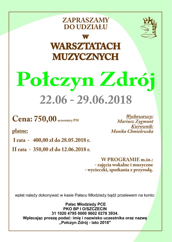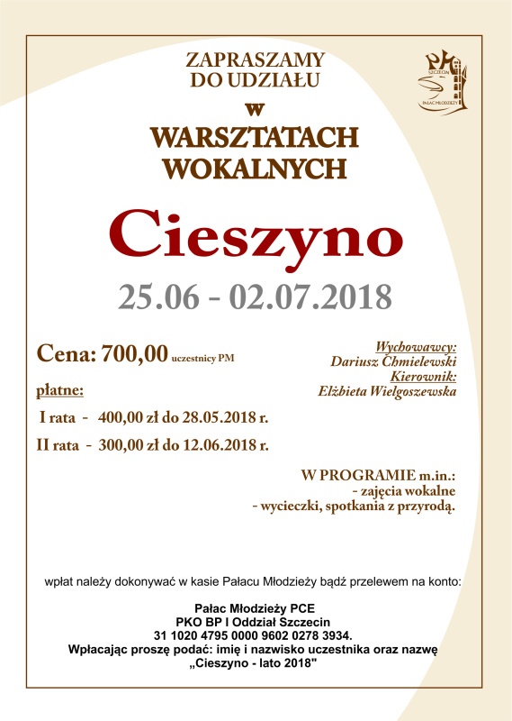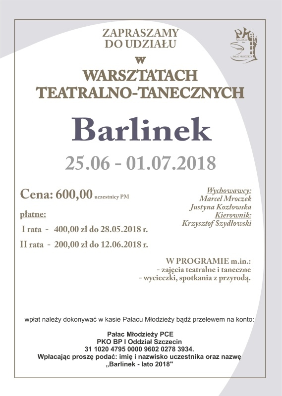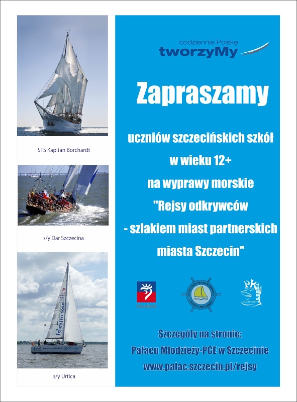 Jednocześnie informujemy, że Pałac Młodzieży organizuje warsztaty wyjazdowe do Cieszyna, Barlinka i Połczyna Zdroju dla uczestników zajęć pracowni wokalnej, muzycznej, tanecznych i teatralnych (nabór zamknięty) oraz wyprawy morskie w ramach Szczecińskiego Programu Edukacji Wodnej i Żeglarskiej, dla uczniów szczecińskich szkół, w wieku 12+ – „Rejsy odkrywców – szlakiem miast partnerskich” (zapisy do 30 maja b.r. – nabór otwarty). Szczegółowe informacje na temat rejsów – TUTAJ.
