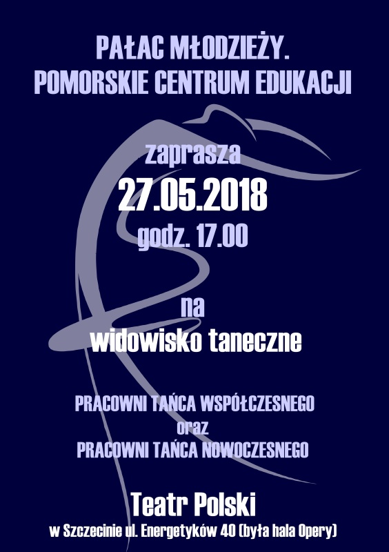 27 maja 2018 r. na scenie Teatru Polskiego przed licznie zgromadzoną publicznością wystąpiło ponad 100 młodych tancerek z Pałacu Młodzieży. W widowisku Pracowni tańca współczesnego i Pracowni tańca nowoczesnego pod opieką artystyczną p. Ewy Szachoń i Anety Pilarskiej – Adamus, w dwudziestu choreografiach, dziewczęta zaprezentowały swoje umiejętności. Oczywiście młode artystki zostały nagrodzone gromki brawami! Całość poprowadził p. Marcel Mroczek z Pracowni teatralnej.