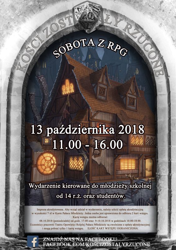 Serdecznie zapraszamy zarówno osoby „zielone” w temacie, jak i zaznajomione z RPG na 29 odsłonę „Kości”, która będzie miała miejsce 13 października w godz. 11-16 w Pałacu Młodzieży. Nowicjuszom wytłumaczymy, na czym polega gra wyobraźni, a bardziej zaawansowanym dostarczymy niezapomnianych wrażeń. Wystarczy w dniu 8.10 (g.17-18) oraz 9-10.10. (godz.10-18) przyjść do kasy Pałacu Młodzieży i opłacić akredytację (7 zł). Przygoda będzie już na Was czekała.