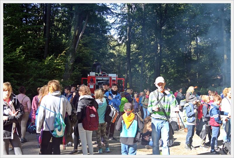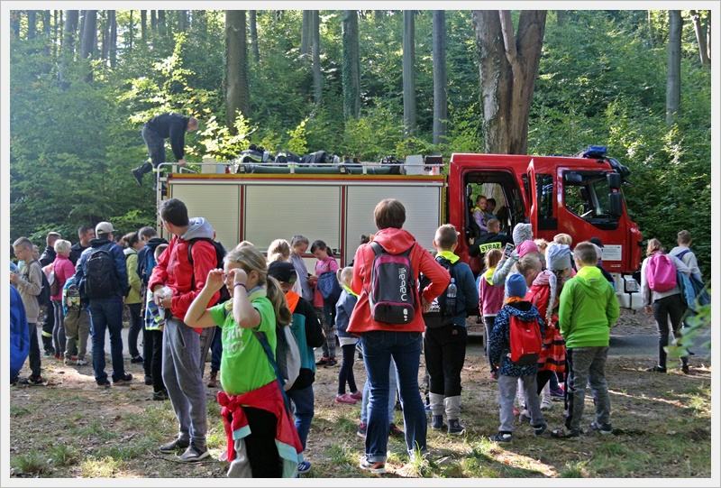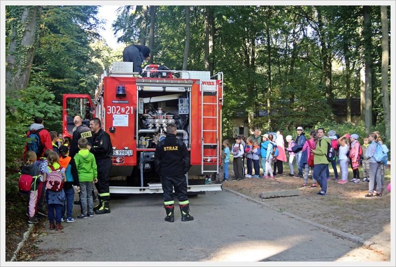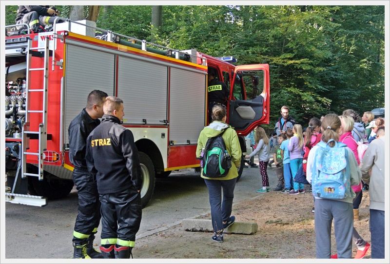 W sobotę 29 września odwiedzili nas strażacy ze szczecińskiej Państwowej Straży Pożarnej. Przyjechali wozem bojowym i każdy uczeń z zainteresowaniem oglądał jego wyposażenie. Panowie strażacy opowiadali o bezpiecznym używaniu ognia w lesie. Młodzież usłyszała jak zachować się rozpalając ognisko i co należy zrobić gdy zauważy się ogień w lesie. Były też pytania i nagrody za wspaniałe odpowiedzi na nie. Przy okazji odbyła się sesja zdjęciowa w kasku i strażackimi atrybutami. A potem pożegnaliśmy się ze strażakami, bo zostali wezwani na akcję.