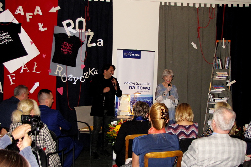 Napięcie spadło, emocje powróciły do normy, kiedy potoczyła się swobodna rozmowa pomiędzy szacowną Jubilatką a jeszcze szacowniejszym Jubilatem na tematy ich osiągnięć literackich i wspólnych dokonań. Prezentacje – piosenek z płyty WE ŚNIE oraz fragmenty książki Z AKCENTEM NA… poszukiwanie znaczeń, które przeczytała Autorka, zamykały kolejną część tego bogatego repertuarowo wieczoru.