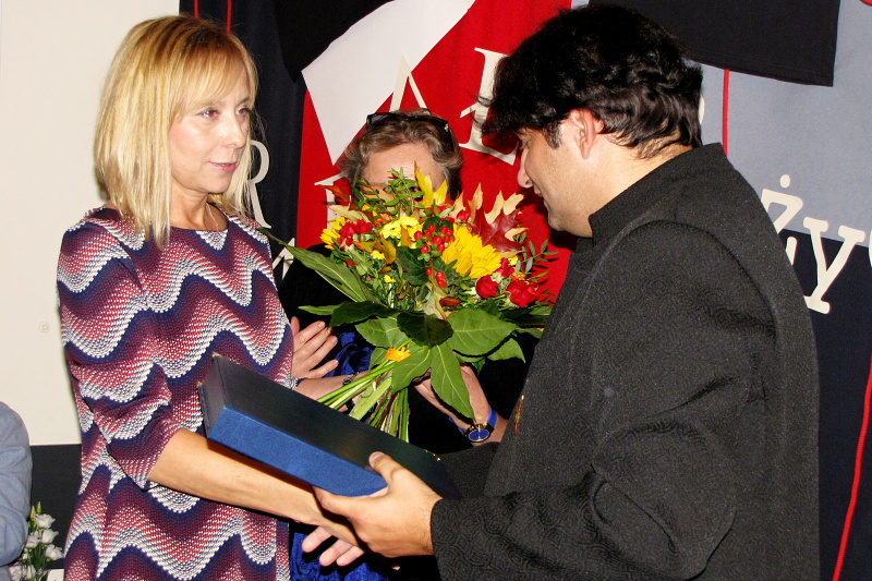 Anna Alina Cybulska-Lebioda z oddziału bydgosko-toruńskiego ZLP odczytała list intencyjny i wręczyła Rafałowi Podrazie „Feniksa”, nagrodę im. Tadeusza Micińskiego, przyznaną za książkę „Anna Jantar Ikona z przypadku?”.