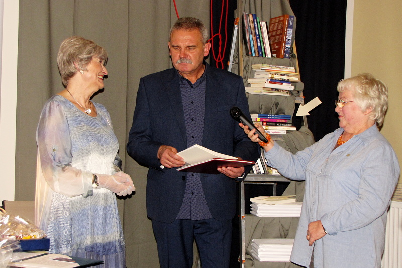 Wystąpiła p. wicedyrektor Książnicy Pomorskiej, Bożena Winiarska, która przekazała gratulacje od dyrektora Lucjana Bąbolewskiego. Laudacje prezesa Leszka Dembka i upominki w postaci obrazów autorstwa Edwarda Siekierzyńskiego niezwykle wzruszyły Jubilatów. Upominki – ceramiczne rękodzieła, z rąk wicedyrektor Pałacu Młodzieży, Katarzyny Lubińskiej uwieńczyły część uroczystości honorowania bohaterów wieczoru.