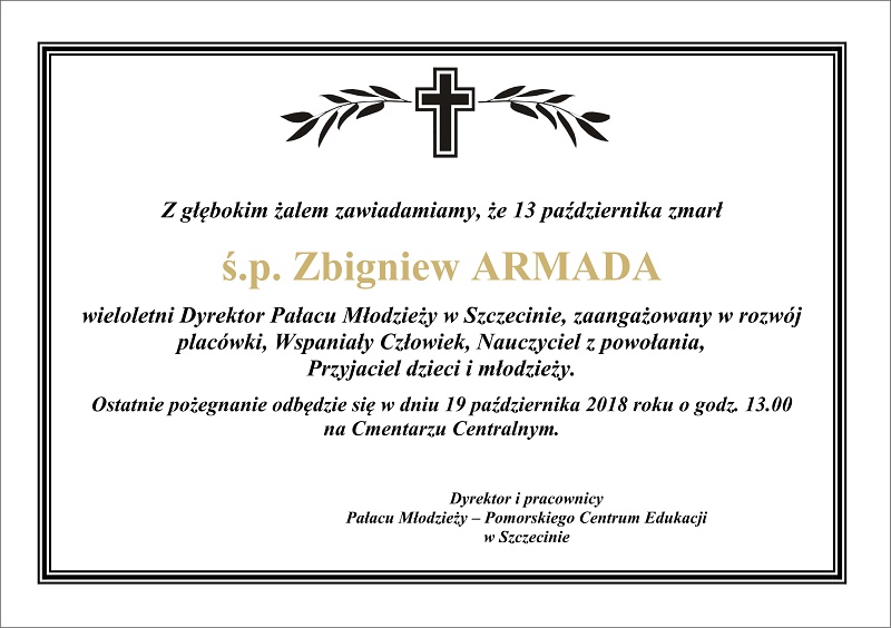 Żegnamy ś.p. Zbigniewa Armadę Pałac Młodzieży Opublikowano w 17 października, 2018 o 9:34 przez Dział Organizacyjny- Monika22 października, 2018 o 10:32 Zbigniew Armada – dyrektor Pałacu Młodzieży w latach 1976 -1990.