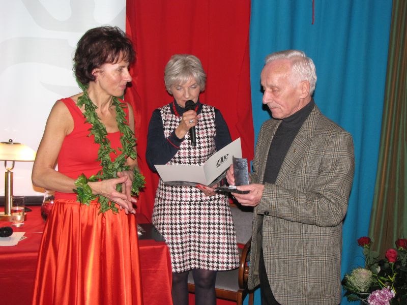 Oprócz wielu ciepłych słów, kwiatów i podarunków wyróżnieniem dla mnie było przybycie Szefa ZLP – Leszka Dembka oraz niezwykły prezent od szczecińskiego ZLP – statuetka z wygrawerowaną okładką „Aponii w ogrodzie” wykonana przez Waldemara Wasilewskiego. Dziękuję wszystkim z całego serca za niezapomniane wrażenia, także tym, którzy wspierali mnie duchowo, jak Anna Tawłowicz – zawsze razem z Jurkiem obecna w moich myślach, mowie i w sercu, a także Przyjaciółki na czele z Adą Jarosz, Joanną Słodyczką, Joanną Babiarz, Aliną Kuberską, Agnieszką Jarzębowską i innymi.”
