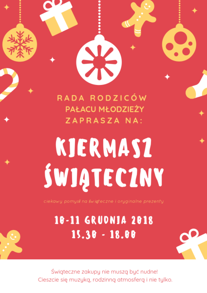 w dniach 10-11 grudnia 2018 r. (poniedziałek, wtorek) w godz. 15.30 – 18.00 organizowany jest w Pałacu Młodzieży Kiermasz Świąteczny. Każda pracownia będzie miała do dyspozycji stoisko, na którym będzie mogła sprzedawać swoje prace i tym samym promować pracownię. Chętnych rodziców wraz z dziećmi zapraszamy do wspólnej zabawy. Możecie upiec ciasto, pierniki a także wykonać drobne prace związane ze Świętami Bożego Narodzenia. Chęć wzięcia udziału, prosimy zgłaszać do swoich nauczycieli prowadzących, do dnia 26 listopada 2018 r. (poniedziałek). Liczymy na Waszą kreatywność i zaangażowanie.