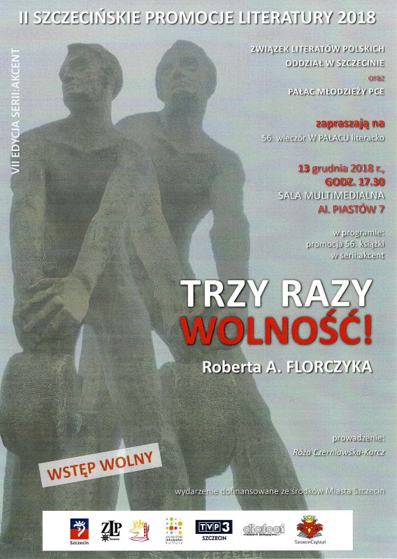 13 grudnia 2018 r., o godz. 17.30 w Pałacu Młodzieży odbędzie 56. wieczór z cyklu W PAŁACU literacko. To ostatnia promocja tego roku, a w niej prezentacja tomu prozy Roberta A. FLORCZYKA TRZY RAZY WOLNOŚĆ!