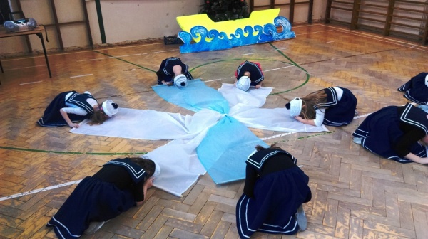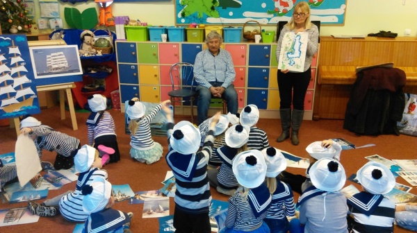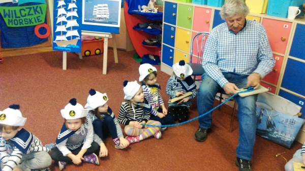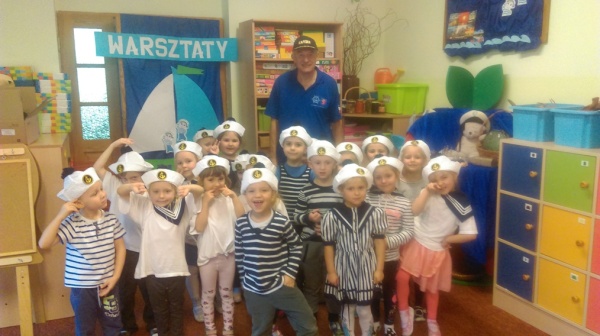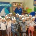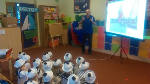24 stycznia tego roku odbyły się w naszym przedszkolu kolejne warsztaty morskie „ABC małego żeglarza” – część pierwsza teoretyczne. Przyjechała do nas i przeprowadziła zajęcia,zaproszona z Pałacu Młodzieży edukatorka żeglarstwa Pani Jola Gałęzowska. Z Panią Jolą przyjechał także gość specjalny – pan Kapitan Żeglugi Mieczysław Ircha. Na początku spotkania, żeby goście mogli odrobinkę odpocząć po podróży do Podjuch, Wilczki Morskie zaśpiewały kilka szanteczek dziecięcych i zatańczyły piękny morski taniec do piosenki „Morze moje morze”. A potem dziećmi zajęli się już zaproszenie Edukatorzy. Pani Jola pokazała dzieciom plakaty z przeróżnymi żaglowcami, omówiła ich rodzaje i przypomniała najważniejsze elementy budowy statku: rufa, dziób, burta, maszt, reja i żagle. Oprócz pojęć już wcześniej znanych dzieci dowiedziały się co to jest bukszpryt, galion, kanga, bloczek do liny i bandera. Zobaczyły żaglowiec, jach i fregatę. Oglądały gwizdek bosmański i róg mgłowy i poznały ich zastosowanie i różne sygnały wydawane przez te przyrządy. Kolejnym ważnym punktem było pokazanie dzieciom jak bezpiecznie trzeba zachowywać się na statku i co jest potrzebne do żeglowania. Pan Kapitan zaś pokazał dzieciom różne bandery zwieszane na żaglowcach i opowiadał pasjonujące historie ze swoich rejsów. Podzielił się też taką ciekawostką jak przesądy żeglarskie i morskie, w które wierzą żeglarze. Umówiliśmy się na drugą część „ABC małego żeglarza – warsztaty praktyczne na maj. Świat rejsów morskich i żeglowania pochłonął nas całkowicie a dzieci przez całą godzinę słuchały i brały udział w lekcji morskiej jak zaczarowane. Było niesamowicie! Ahoooj!