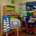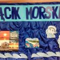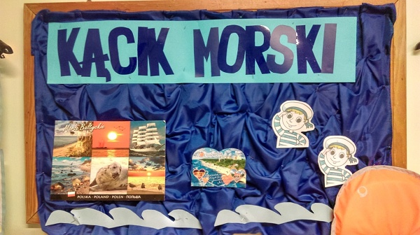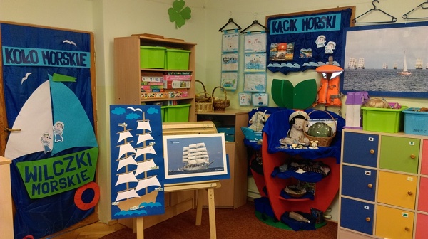 Kolejnym krokiem w naszej Edukacji Morskiej było założenie w październiku Kącika Morskiego w naszej grupie . Nasze Wilczki Morskie zaangażowane od września w działalność Koła Morskiego przez cały październik znosiły przeróżne rekwizyty i przedmioty związane z morzem i żeglowaniem. I tak, w kąciku znalazły się muszelki, kamienie znad morza, piasek z plaży, butelki piaskiem, żaglowce, żaglówki, pocztówki, chustki, kapoki, czapki marynarskie, książeczki z opowieściami morskimi , figurki zwierząt morskich, plakaty i wiele wiele innych. Niektóre też wiązały się ciekawymi opowieściami jak przygoda Olka z kapokiem na rodzinnej wyprawie na kajaki.