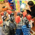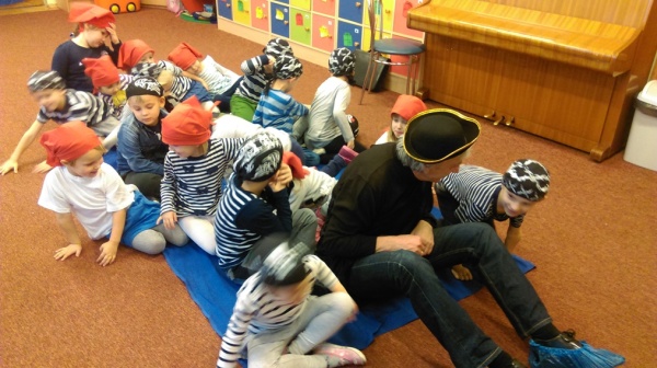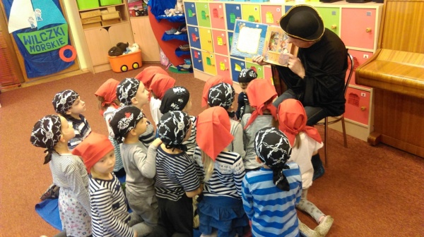 Na początku stycznia Wilczki Morskie zaprosiły na spotkanie kolejnego gościa. Przybył do nas dziadek Wojtka z naszej grupy, który tego dnia zamienił się w całkiem groźnego Pirata. Przeczytał dzieciom kilka opowieści morskich i pirackich min. „Przygoda na pirackim statku” co wszystkich zachęciło do dalszych pirackich zabaw. Wraz z dziadkiem śpiewaliśmy morskie i pirackie piosenki, prowadziliśmy gimnastykę piratów, szorowaliśmy pokład, stoczyliśmy bitwę morską na papierowe kule, walczyliśmy ze sztormem i burzą podczas wyprawy na pirackim statku i na koniec dopłynęliśmy do czekoladowej wyspy. Mniam … Zabawy morskie są super! Ahoooj!