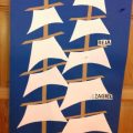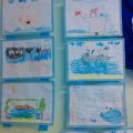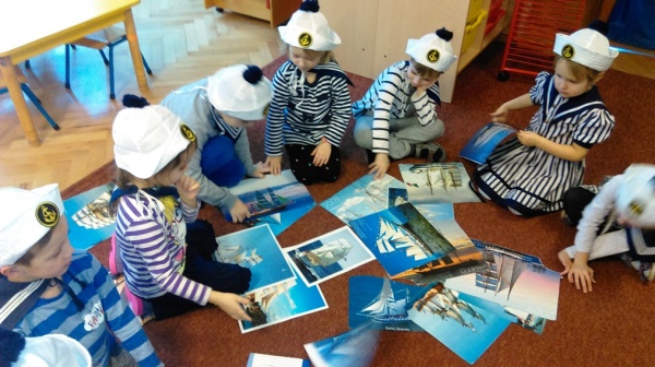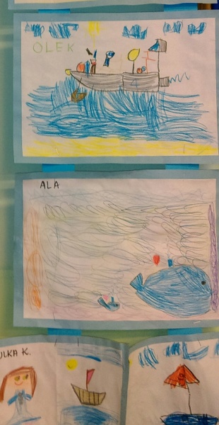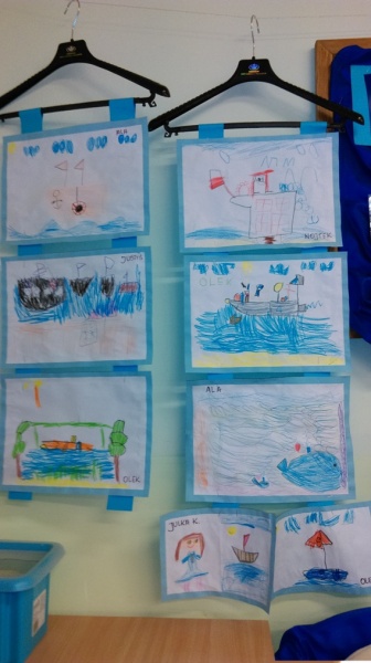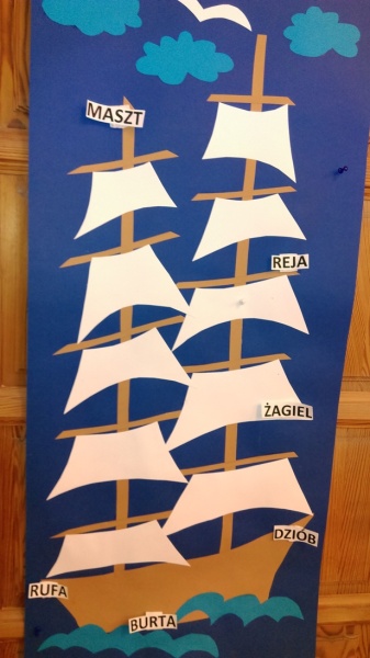 W październiku również Wilczki Morskie dostały pierwszą krótką lekcję żeglarstwa. Wraz z wychowawczynią, która tego dnia zmieniła się w Bosmana Ana zrobiły plakat dużego żaglowca, dwumasztowca i poznały pierwsze żeglarskie pojęcia: rufa, dziób, burta, maszt, reja, żagle. Potem, do końca dnia dzieci same zadawały sobie zagadki „a co to jest burta ? a pokaż gdzie jest maszt?” i utrwalały poznane nazwy i elementy. Zajęcia zainspirowały również je do działań plastycznych i przez cały dzień rysowały żaglowce według własnego pomysłu. Powstała całkiem pokaźna galeria, umieszczona w naszym Kąciku Morskim.