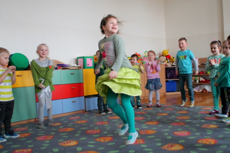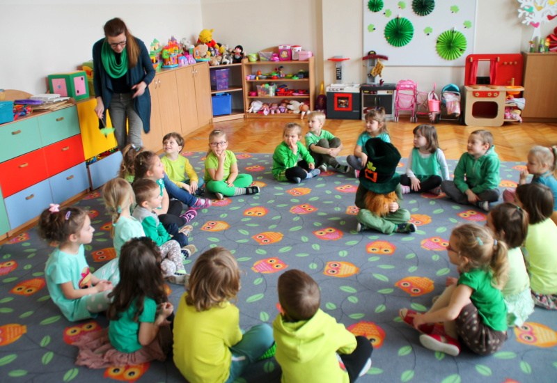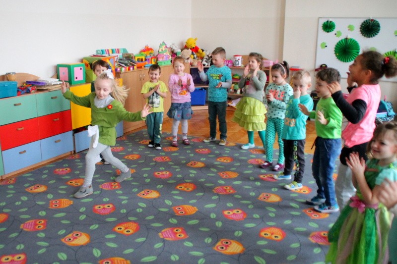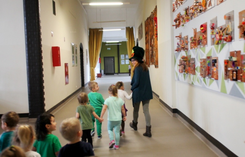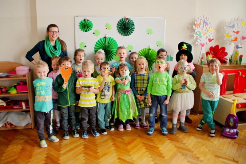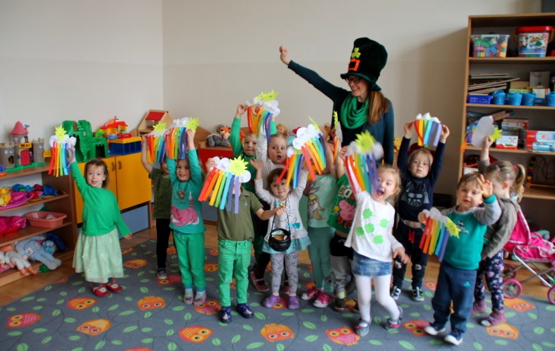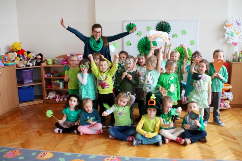 Tego dnia dzieci ubrały się w kolor zielony – narodowy kolor Irlandii, nawiązujący do trawiastego krajobrazu wyspy i symbolizujący koniczynę. Podczas zajęć królowały irlandzkie zabawy i tańce. Dużo emocji wzbudziło poszukiwanie zagubionego skarbu skrzata. W podziękowaniu za jego odnalezienie, Leprechaun obdarował przedszkolaków złotymi monetami!