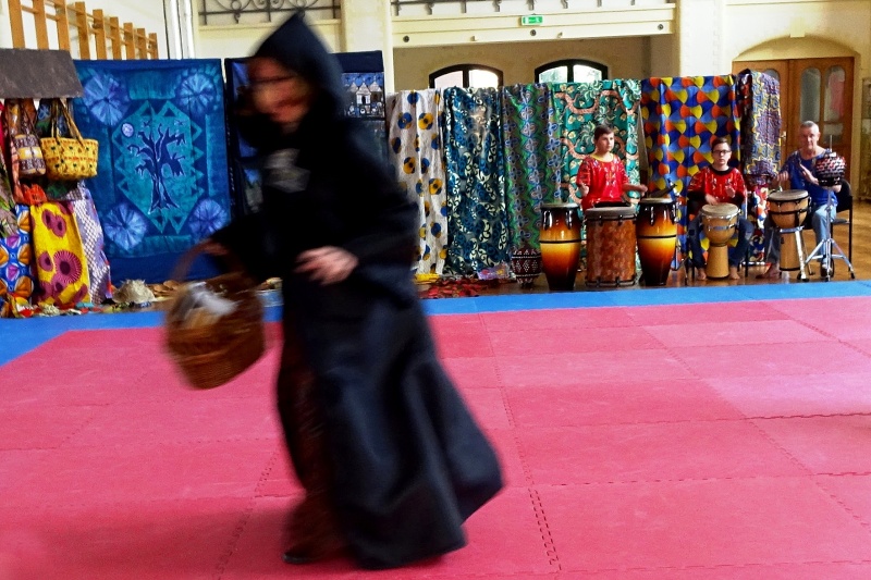 W sobotnie popołudnie, 23 lutego, podczas Pałacowego Uniwersytetu Fantastycznego w sali gimnastycznej Pałacu Młodzieży rozbrzmiały bębny. Warsztaty tańca afrykańskiego poprowadziła Justyna Kozłowska (Pracownia Tańca Etnicznego), a akompaniował Ryszard Dziubak (Pracownia Muzyki Etnicznej) ze zdolnymi, młodymi bębniarzami. Magia Afryki przyciągnęła nie tylko uczestniczki warsztatów tanecznych, ale i ciekawych atrakcji widzów. Nawet Pani Pufetowa z koszykiem na moment dołączyła do tancerek. Oczywiście tylko na chwilkę bo miała przecież inne obowiązki.