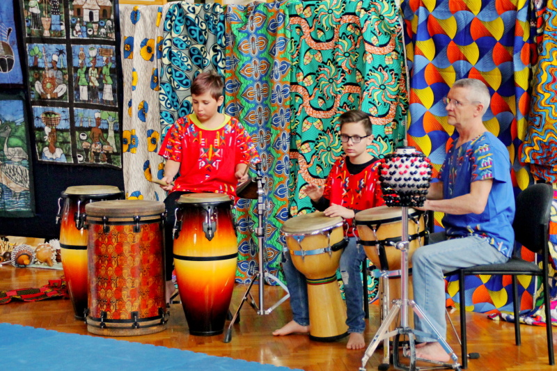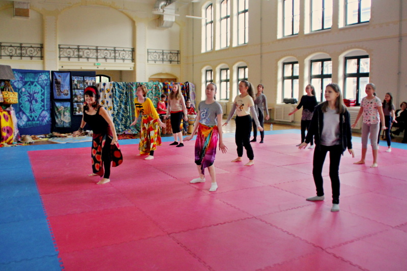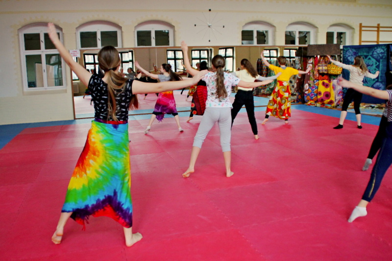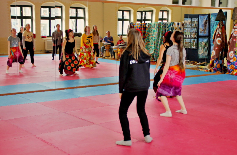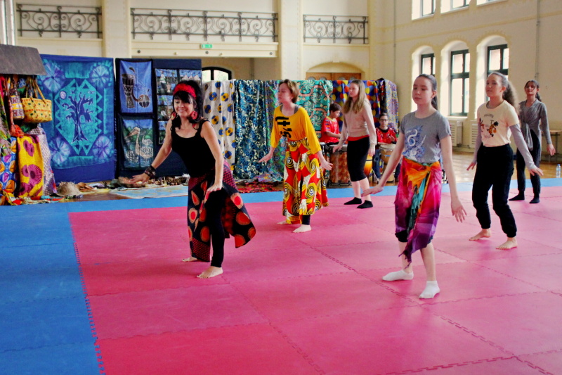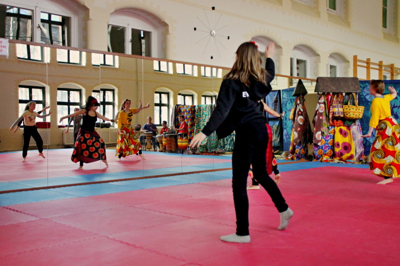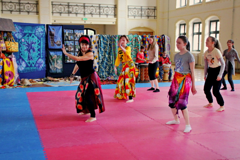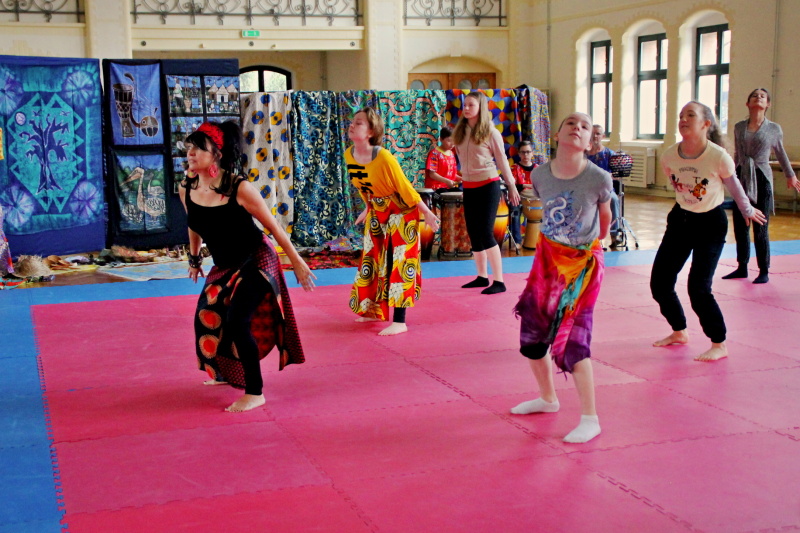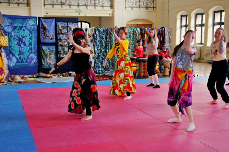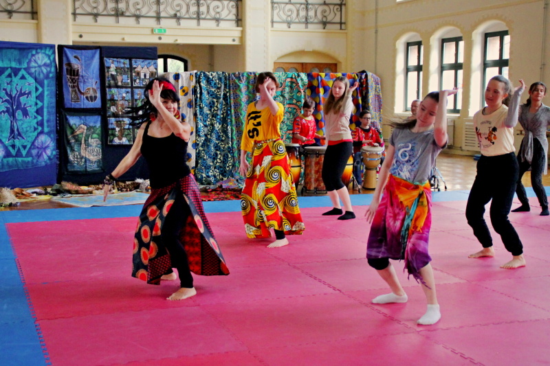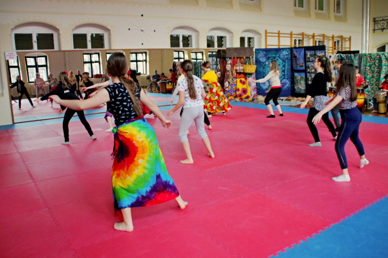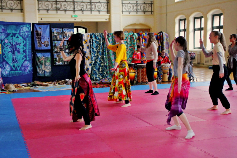 Pufesorka Justyna Kozłowska wprowadziła uczestników w prawdziwie afrykański klimat za sprawą dekoracji, tkanin, instrumentów, a także opowieści wprost z Afryki. Energia tańca i rytmów afrykańskich udzieliła się wszystkim zarówno tańczącym jak i obserwującym warsztaty. Pracownia Tańca Etnicznego ma okazję obcować z tą wyjątkową formą tańca na swoich cyklicznych zajęciach.