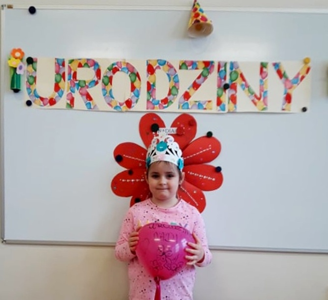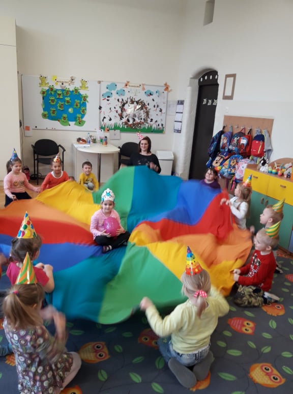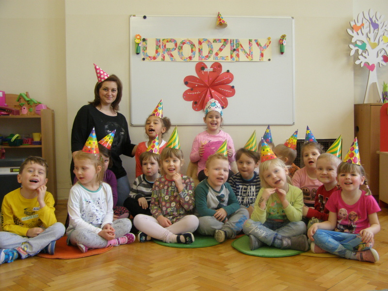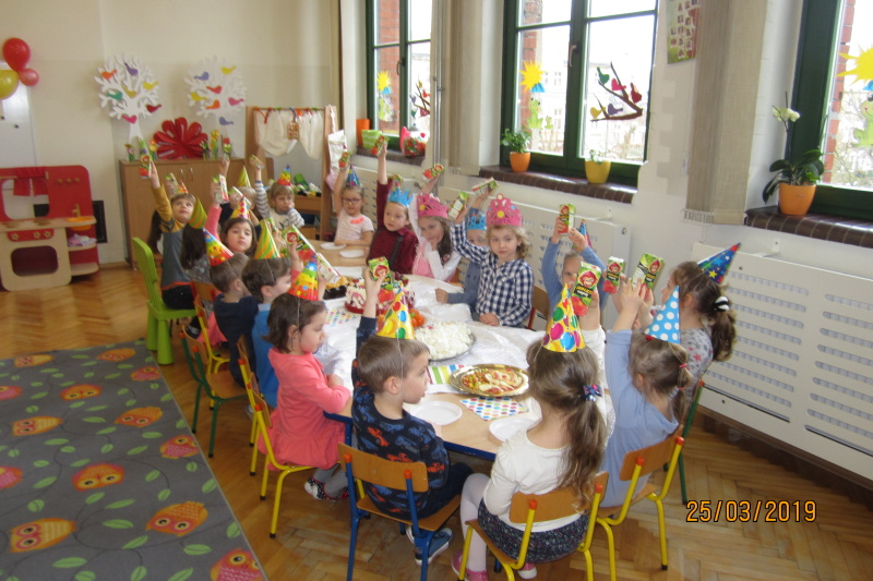 Jubilaci otrzymali kolorowe korony i balony. Były wspólne pląsy, zabawy przy muzyce. Dla wszystkich zaśpiewano gromkie „Sto lat”! A na końcu zjedliśmy ze smakiem słodki poczęstunek przygotowany przez rodziców dzieci obchodzących urodziny.