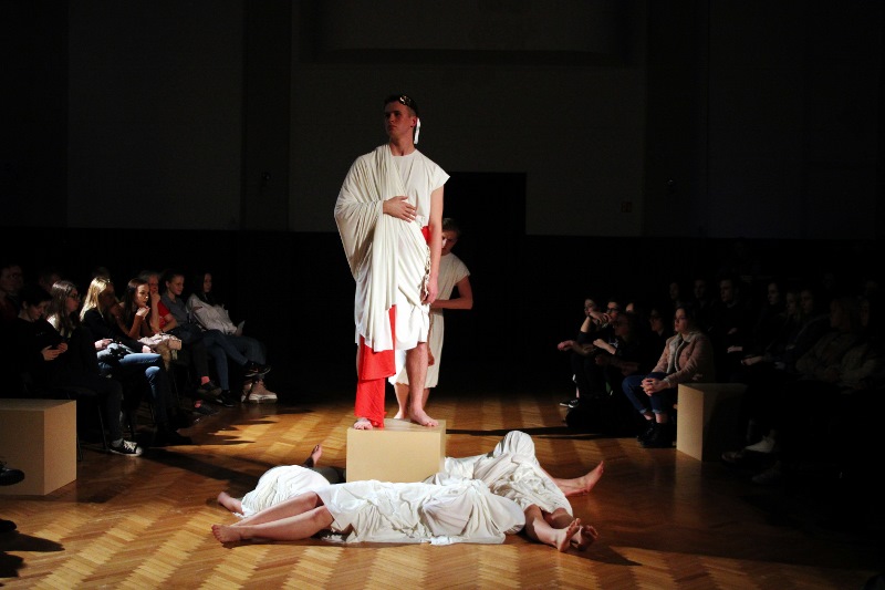 W spektaklu wykorzystano fragmenty „O państwie” Cycerona, „Żywotów Cezarów” Swetoniusza oraz epigramat Marcjalisa.