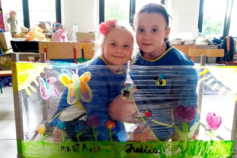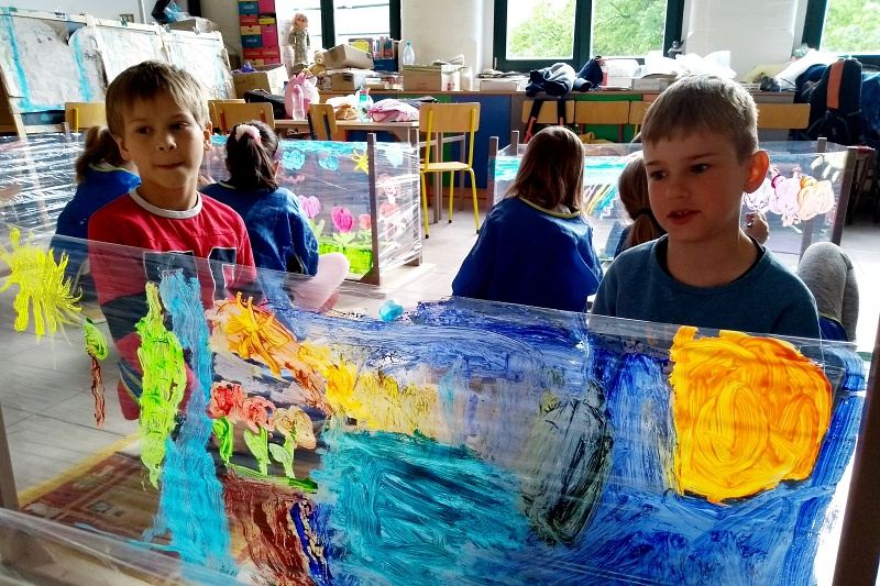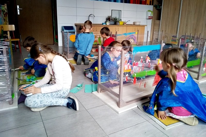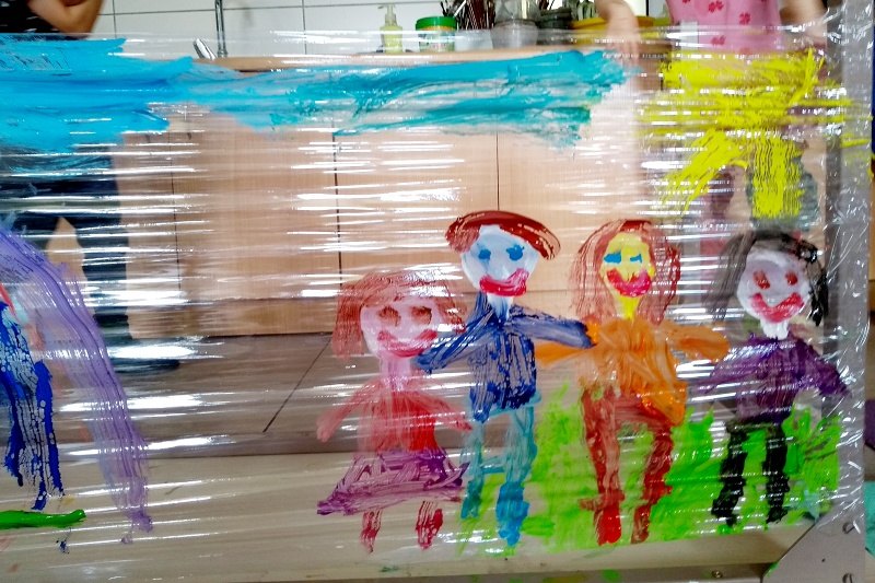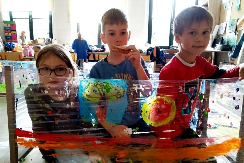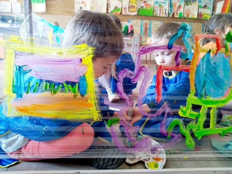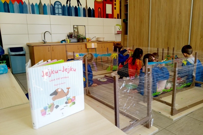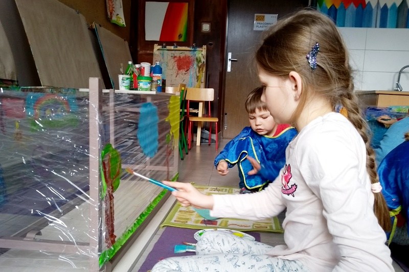 Książka „Jejku-jejku chce coś zmienić” stała się inspiracją do niecodziennych zajęć w Pracowni plastycznej Magdaleny Kucharskiej. Książka opowiada historyjkę, jak pewien wesoły dziobak chciał przemalować swój pokój. I oto dzieci z pracowni miały możliwość pomalować „ściany” w małym domku, ustawionym z ławek poodwracanych do góry nogami. Każdy mógł namalować własny obraz, w ulubionych kolorach, siedząc na ziemi. Dzieciom bardzo spodobał się pomysł odwróconych ławek, a malowanie na folii dawało dodatkowo wrażenie przestrzeni. Nasz mózg nie lubi schematu (monotonii/sztampy), warto więc urozmaicać dzieciom „nudne” lekcje, czy nawet odrabianie lekcji. Niech spróbują pod biurkiem, czy też w innym niestandardowym miejscu, może lepiej im pójdzie? 🙂