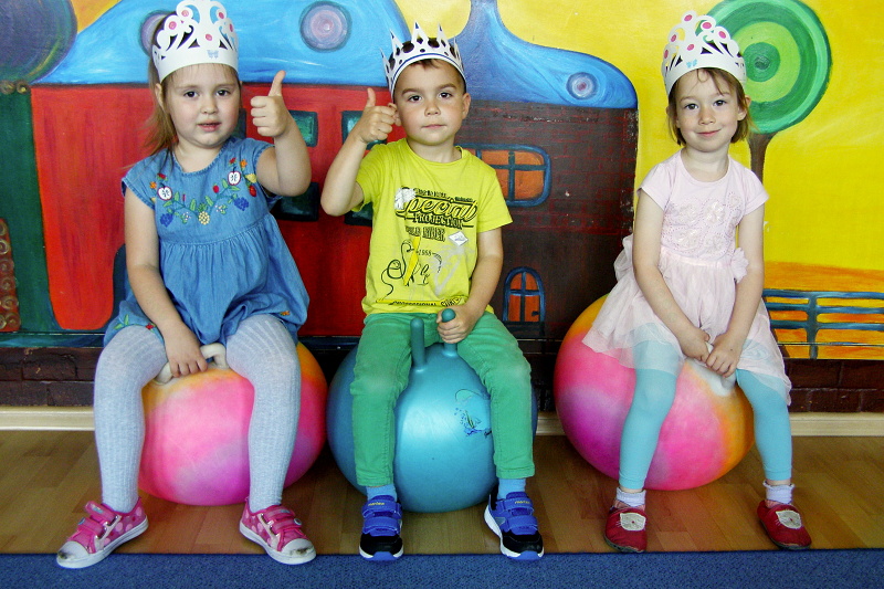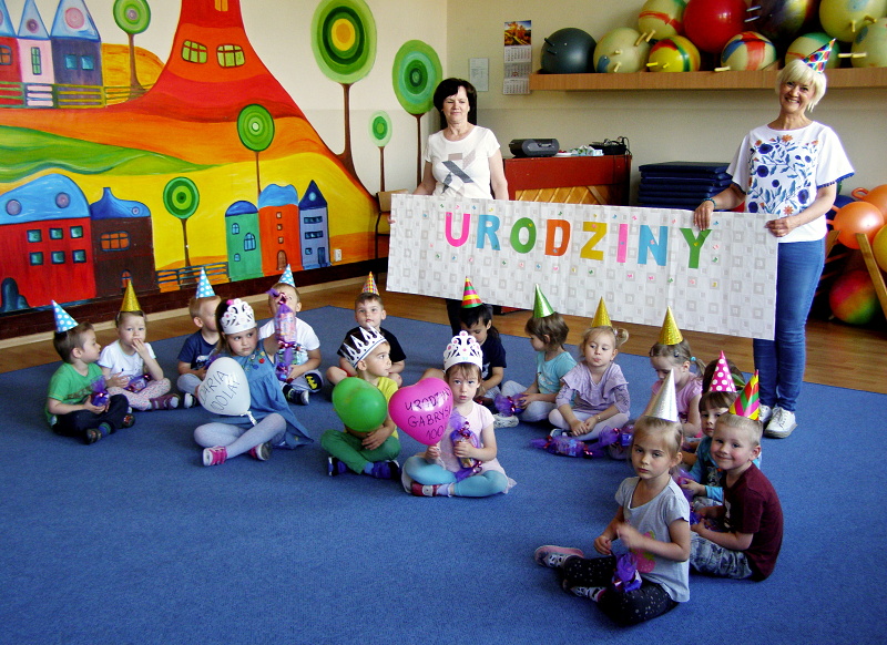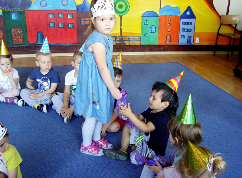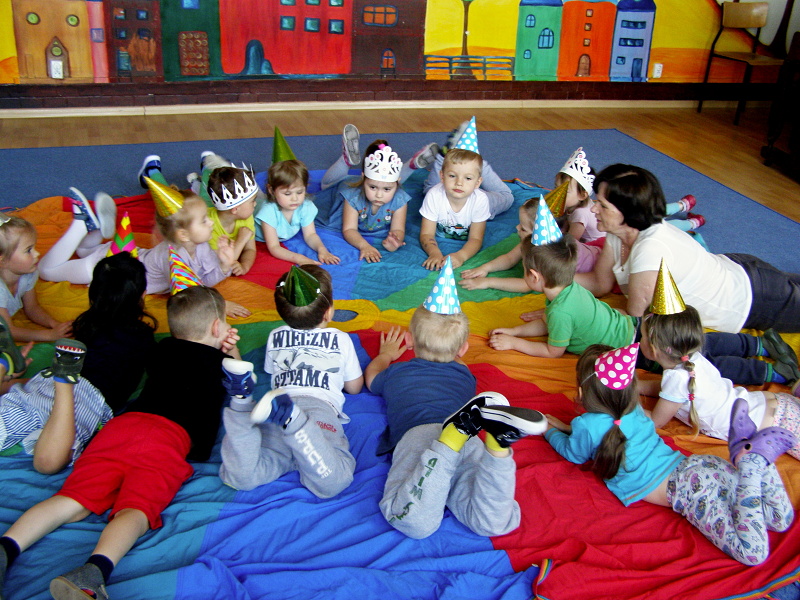W maju, 4 urodziny obchodzili: Daria, Gabrysia i Jarek z grupy I. Jubilaci jak zwykle zostali uhonorowani koronami i balonami. Dzieci złożyły im życzenia, odśpiewały „Sto lat” i wszyscy udali się do sali rytmicznej, gdzie wesoło bawiliśmy się przy muzyce z chustą animacyjną.
