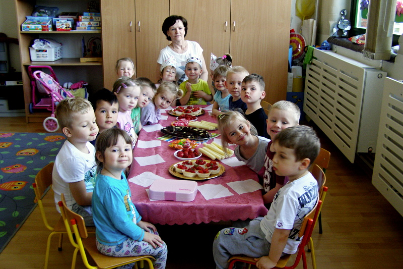 Następnie zasiedliśmy do słodkiego poczęstunku przygotowanego przez rodziców. Wszystkie przedszkolaki otrzymały również prezenty i lizaki przygotowane przez dzieci obchodzące urodziny i ich rodziców.