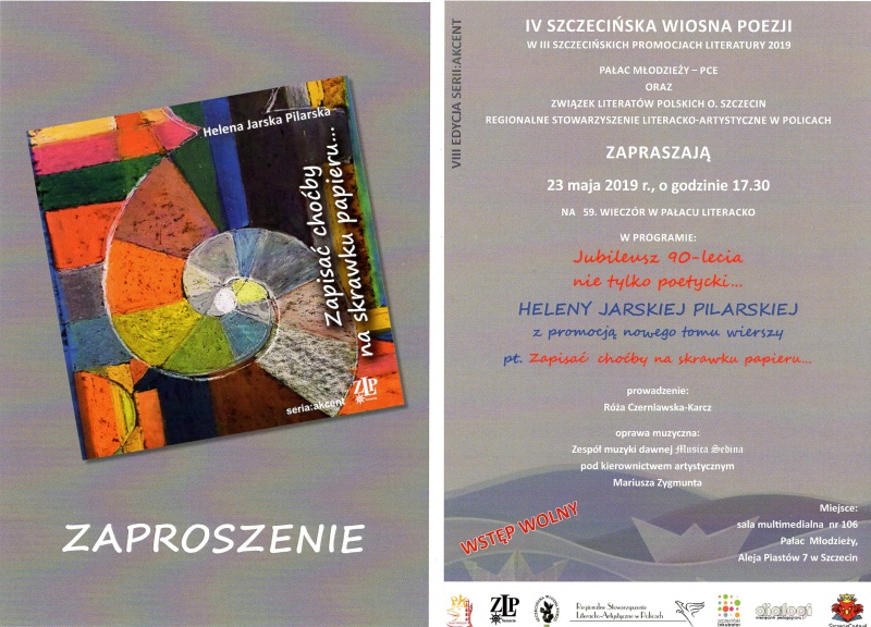 23 maja 2019 r., o godz. 17.30 odbędzie się w sali multimedialnej w Pałacu Młodzieży, przy Al. Piastów 7 w Szczecinie, 59. wieczór W PAŁACU literacko pn. Jubileusz 90-lecia nie tylko poetycki… HELENY PILARSKIEJ z promocją Jej nowego tomu wierszy pt. „Zapisać choćby na skrawku papieru…”